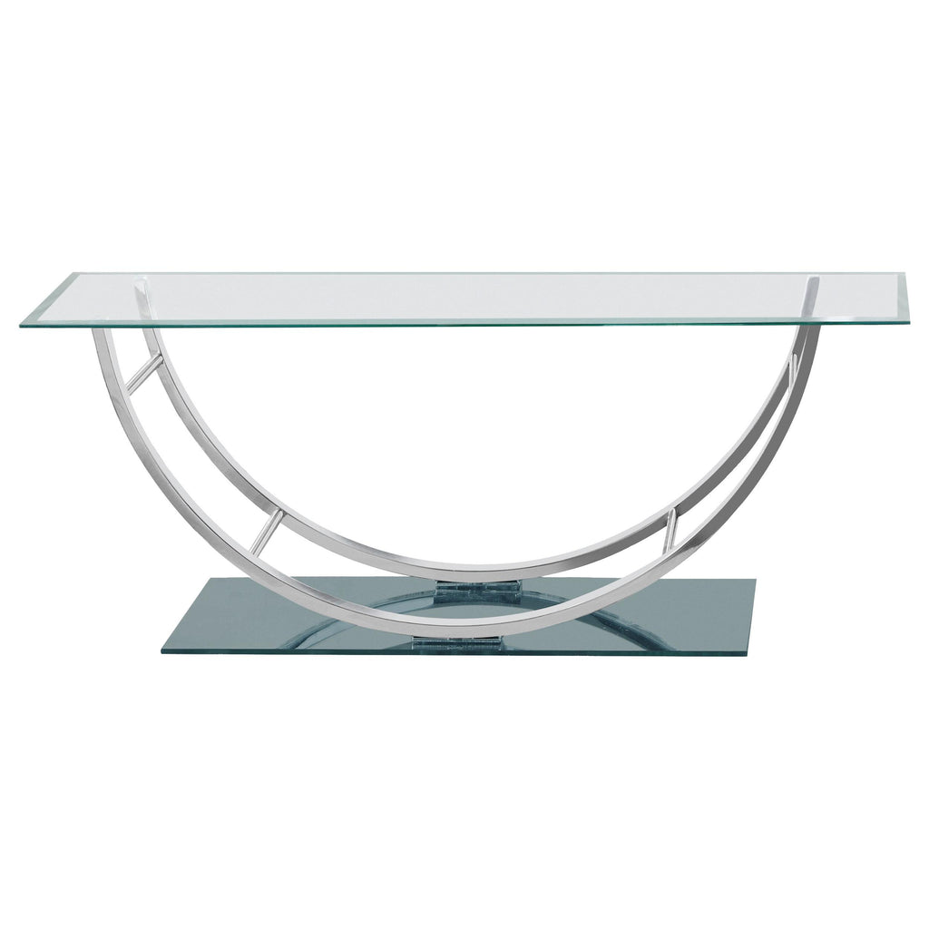 This contemporary rectangular coffee table features a clear tempered glass top and a sleek tempered mirrored base for a polished and modern appeal. The elegantly curved frame, crafted from electroplated heavy gauge metal in a chrome finish, enhances its sophisticated look. Its durable materials and refined structure make it ideal for living rooms, providing a striking centerpiece while ensuring lasting quality.