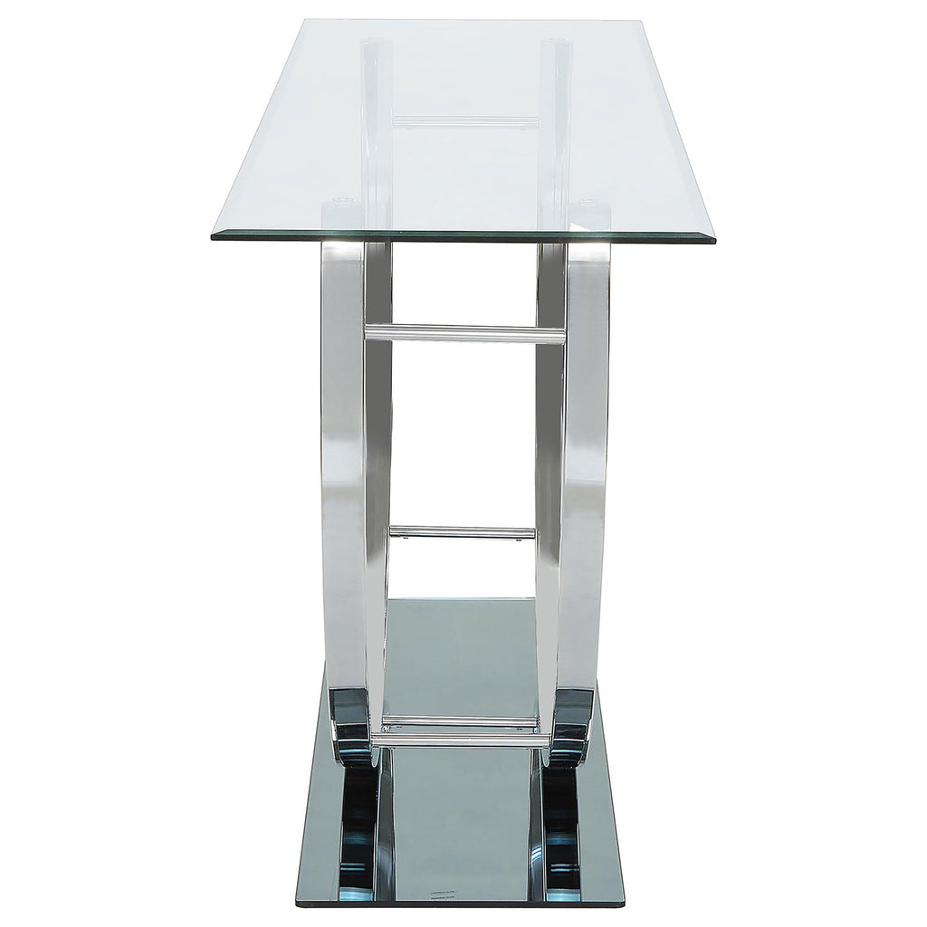This modern rectangular console table showcases a clear tempered glass top paired with a sleek mirrored base, creating a polished, contemporary appeal. The curved frame, crafted from heavy gauge electroplated chrome metal, adds a touch of sophistication and elegance. Built with durable materials, this console table is perfect for entryways, hallways, or behind sofas, offering a striking, functional piece that enhances any modern space while ensuring lasting quality.