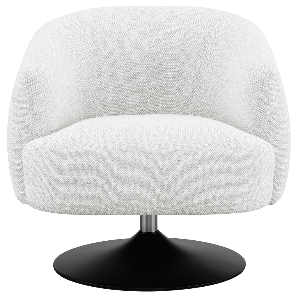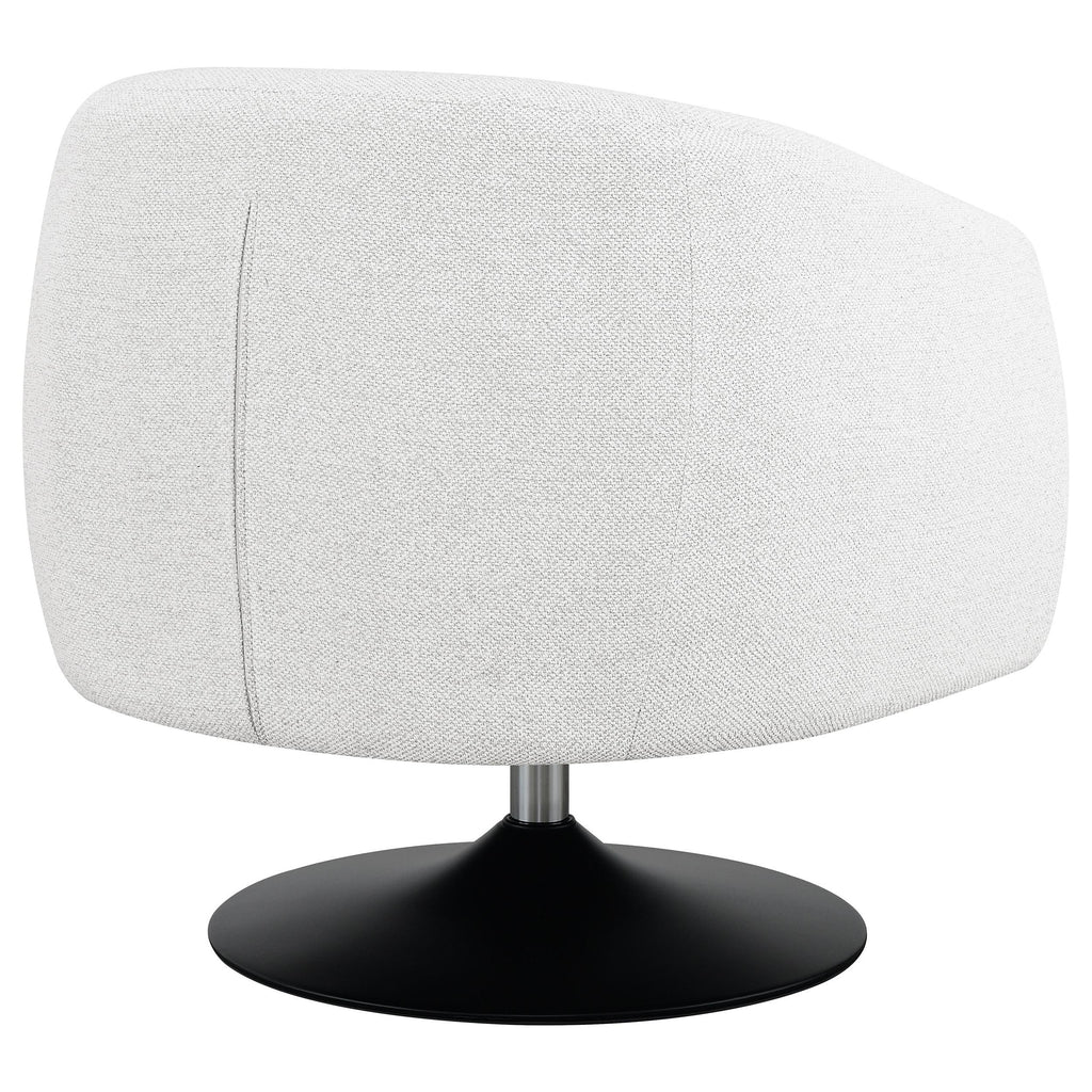 Wrapped in a beige boucle fabric, this contemporary swivel accent chair is the perfect addition to a vintage-inspired home. A throwback to a retro era, the chair offers a barrel style design situated on a pedestal base, swiveling 360 degrees. A wonderful addition to a conversational seating arrangement or open floor plan entertainment space, this chic swivel chair also offers a softly rounded back with subtle channel tufting and tapered off armrests. A waterfall-style, tailored seat cushion further lends to the clean lines of this clever, versatile accent chair. The matte black finish on the base also adds a striking contrast for a modern touch.