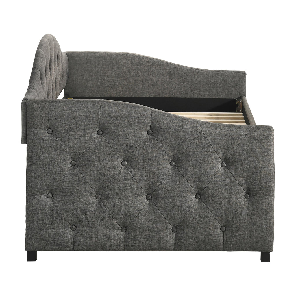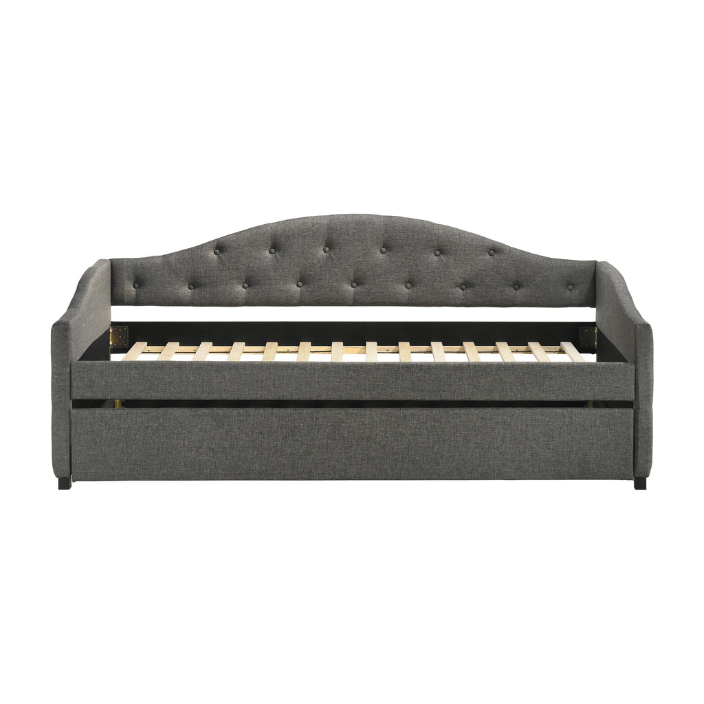Sweeping lines and timeless details come together in this transitional twin daybed and trundle set. Wrapped in a soft fabric that coordinates with all sorts of color palettes, this daybed and trundle combo lends traditional elements such as a button-tufted back and sides. Thin sloped sides and a camelback offer a graceful design and feminine charm to compact rooms where additional sleeping arrangements come in handy. Tucked beneath the main frame is a hidden trundle set, easily retrievable and concealed by a smooth padded panel. Black legs elevate the trundle bed ever so slightly, allowing finished floors and colorful rugs to shine through.