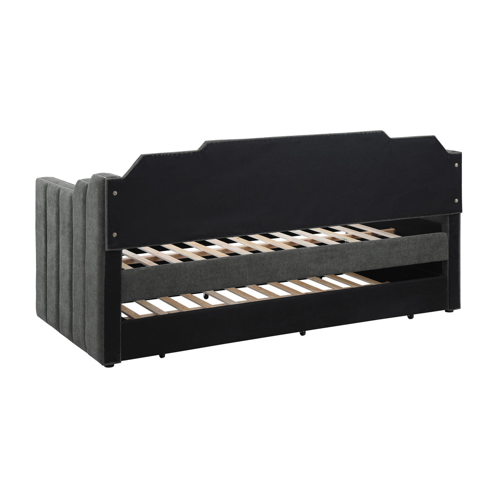 Welcome guests to stay for the night with this contemporary twin daybed and trundle set. Wrapped entirely in a charcoal gray velvet fabric with an Art Deco-inspired channel tufted design and stepped edges, this twin daybed is as stylish as it is comfortable. Slim, straight armrests outlined in a polished chrome nailhead trim define this daybed silhouette while a discreet smooth panel disguises the hidden trundle beneath. Elegant with a modern flair, this twin daybed and trundle is the perfect addition to compact multipurpose spaces like a home office guestroom. And with its gray velvet fabric, this daybed complements your already existing color palette too.