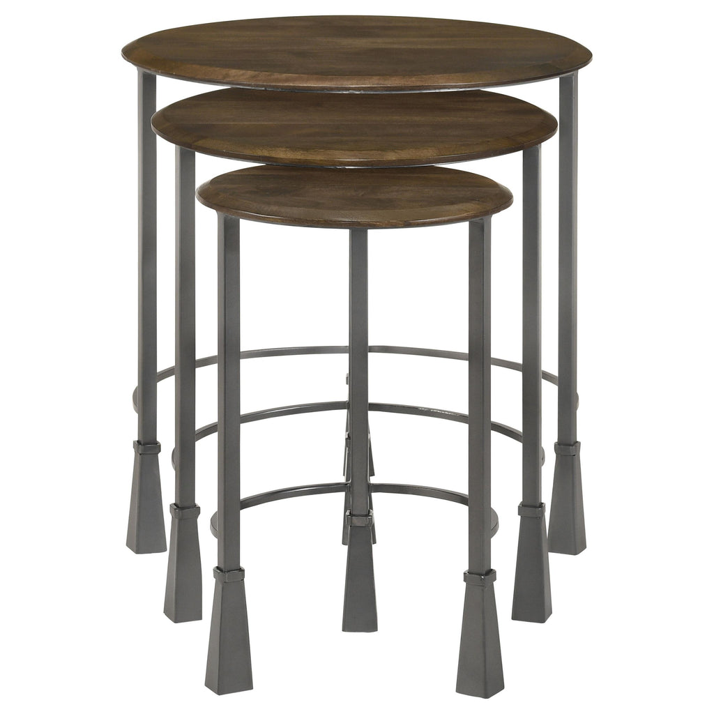 Modern shapes and mixed materials elevate this set of three nesting tables. Designed with natural round tabletops made of eco-friendly mango wood, and situated on gunmetal finish iron legs, this industrial nesting table set is perfect for sustainable homes and lifestyles. Each table features slim tubular legs that extend to the floor with conical flared feet and offer an additional circular brace that mirrors the tabletop. Place this nesting table set in a modern farmhouse home where space is limited. Keep an accent lamp and essentials on the largest nesting table and slide the smaller tables out to serve guests.
