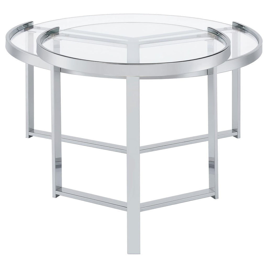 With just a bit of glam style, this casual nesting coffee table set is bright, light, and pleasing. Your living room or family room comes to life with a table set including one large and one small round table that display side by side and nestle together between uses. Pie cut out tops are fitted with a clear tempered glass insert, adding sparkling brilliance. Tripod-style chrome bases create a gleaming effect. A pencil polish edge profile combines with glass transparency to create the effect of floating discs, creating a timeless look with effortless beauty.