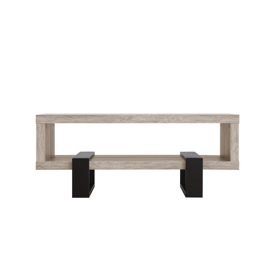 Experience a modern aesthetic with this rectangular coffee table that combines style and functionality. The grey driftwood finish highlights realistic wood grain, creating a rustic yet contemporary look. Crafted from durable engineered wood with a scratch-resistant laminate veneer, it offers long-lasting appeal. The bold black geometric legs provide sturdy support while adding industrial-inspired charm. Its versatile design and lower shelf make it a practical and stylish addition to any living room.