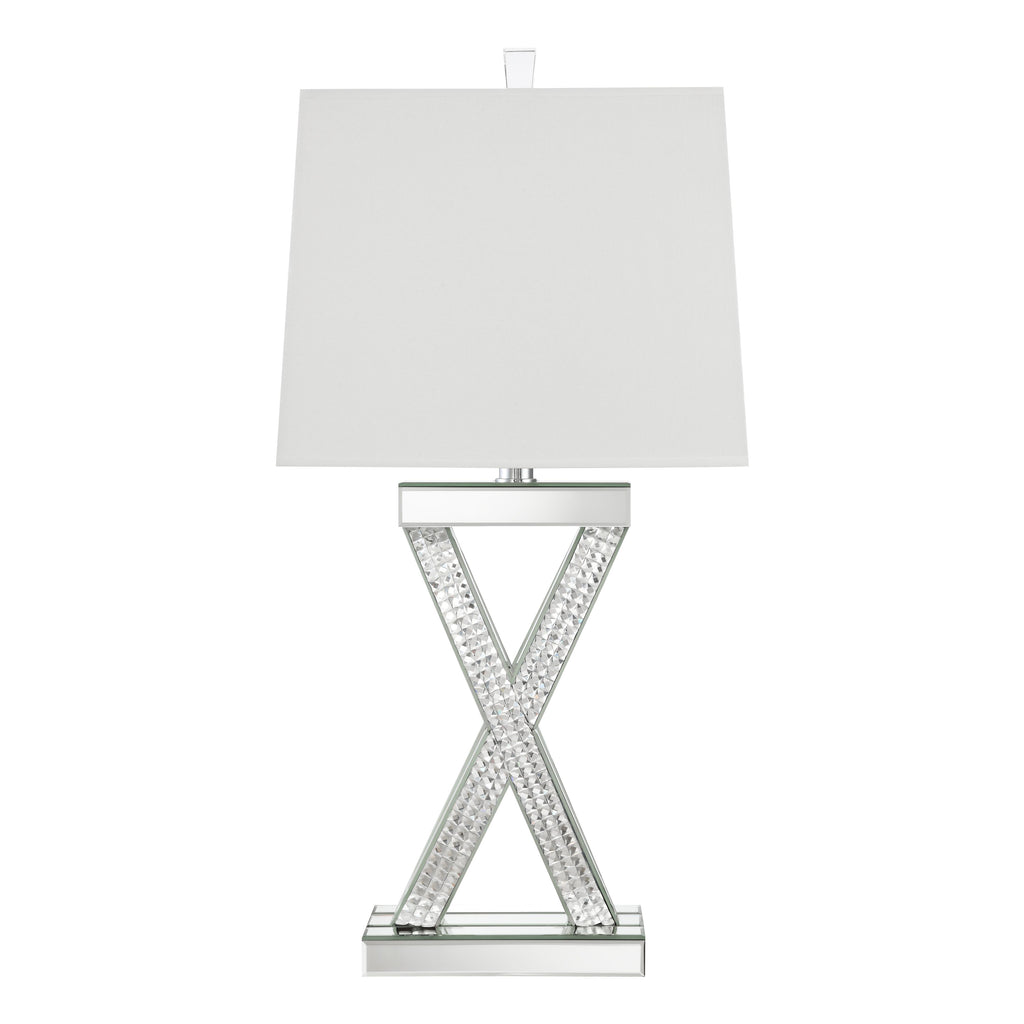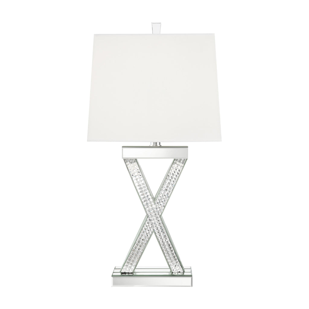 Bold, interwoven lines create an X-shape base of this contemporary table lamp. With a glamorous flair, this stunning table lamp offers up a border of polished square tiles inset within a mirror trim silhouette design. A flush top and bottom covered in mirror tiles holds the sculptural brace intact for a dimensional effect. Topped by a tapered rectangular shade covered in a white fabric, this table lamp puts out a soft, soothing glow to a modern tablescape. An acrylic finial adorns the top for one last dramatic touch.