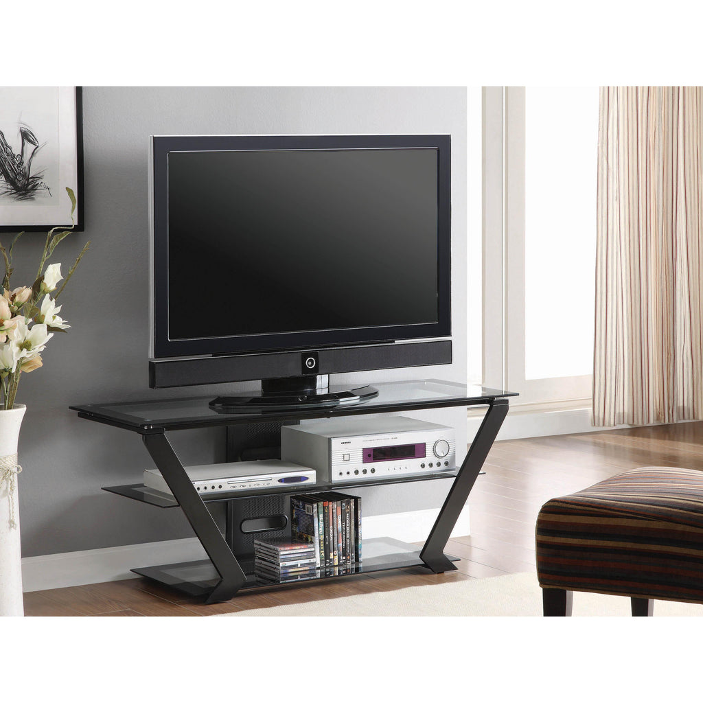 Entertain in style with the modern charm of this sleek TV console. Crisp, clean metal lines flare out into an eye-catching shape, giving it a contemporary look. A large tempered glass top and metal base provide security and stability for your valuable electronics. Two convenient lower shelves offer even more storage space for your home entertainment needs. This console is sure to upgrade the style of any modern living room.