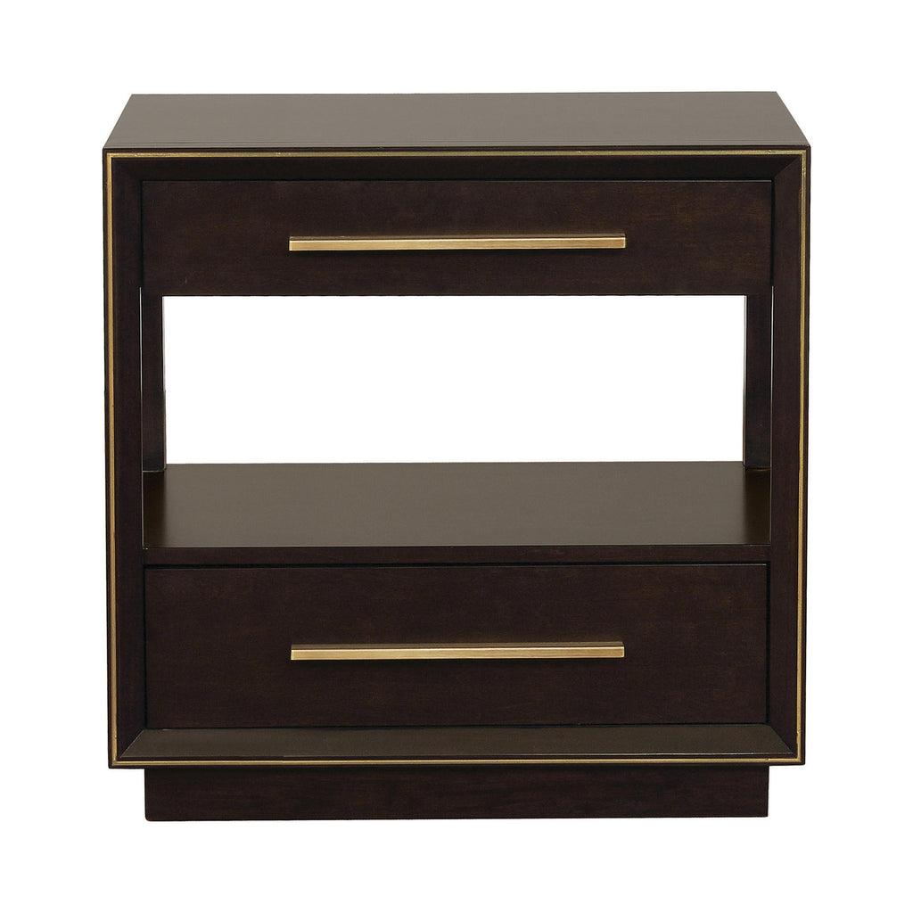 The perfect example of stunning modern design, this California king bedroom set is full of geometric details. Featuring an elongated headboard, the neutral upholstery combines with the warmth of the smoked peppercorn finish to add depth. Versatile and streamlined, this set comes with a nine-drawer dresser, two-dresser nightstand and shelf, and two-drawer chest with doors. Retro inspired details offer structure and personality. Transform your space with the openness of the clean and structured mirror. This set includes the bed headboard, footboard and rails, a dresser, dresser mirror, a chest and a nightstand.