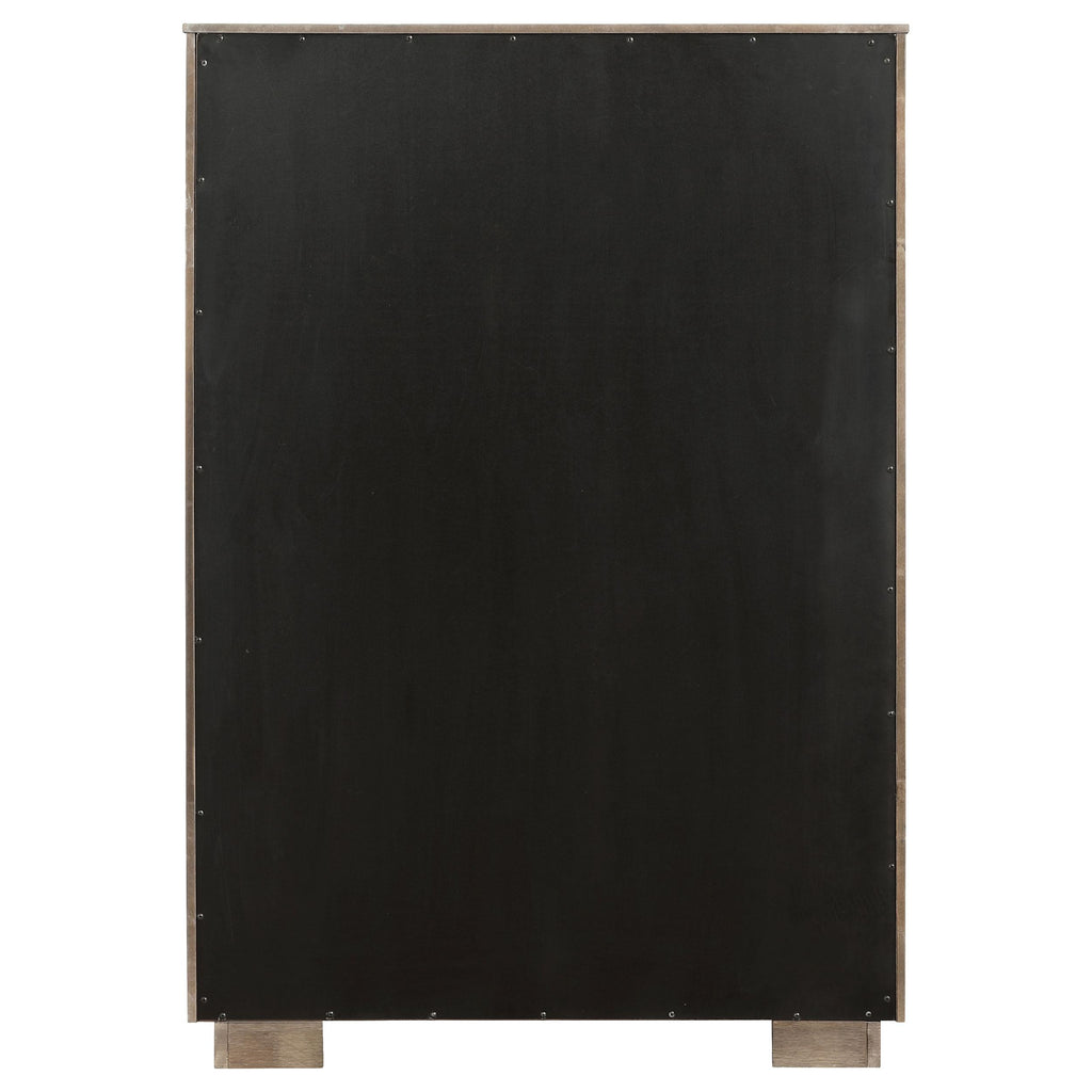 Add easy storage and understated style with a transitional five-drawer chest. Wood grain details show through a Taupe oak finish, creating a hint of dimension and organic character. Five spacious drawers provide ample storage for clothing and accessories. Each is accented with a long bar pull, offering a textural accent to the front of the chest, which features mitered trim. A recessed base and roomy top complete the look.