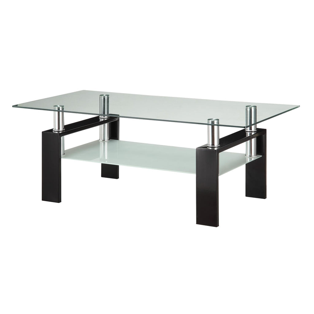 Enhance your living room with this sleek rectangular cocktail table, designed for style and functionality. It features a clear tempered glass top, complemented by a frosted tempered glass lower shelf for added storage or display. Supported by a sturdy metal frame, this coffee table combines durability with a modern aesthetic. Perfect for creating an open and airy look in your space, this table seamlessly blends contemporary design with practical utility.