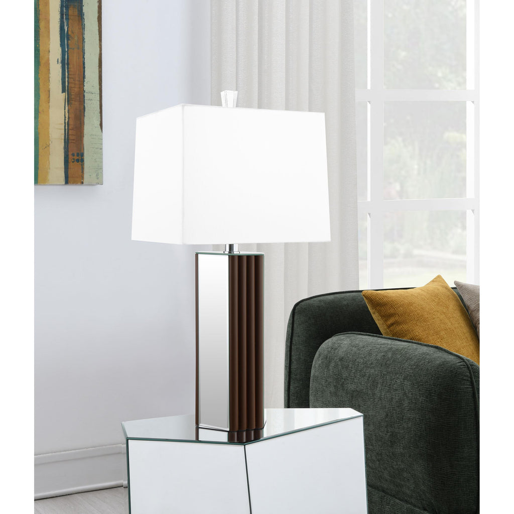 Establish a chic look and feel in your living room with a modern table lamp design. It's a rich, warm choice, featuring a deep brown finish and scallop details that create a sense of texture and artisan character. Mirror panels add brightness and reflectivity, offering contrast without sacrificing cohesive appeal. On top, a flared rectangular shade is covered in white fabric for soft, diffused illumination. A 9-watt LED light bulb offers bright, energy efficient illumination, perfect for tasks and ambiance in a living room, den or bedroom.