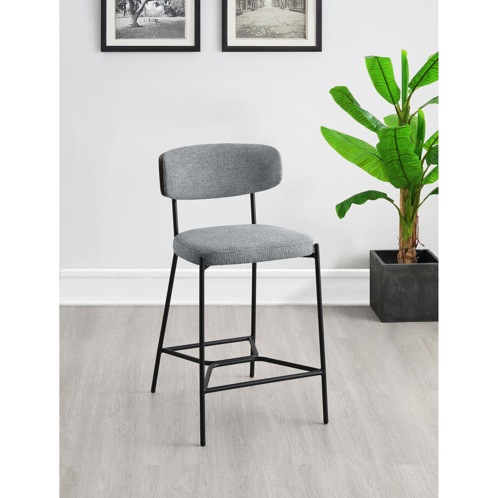 Introduce comfort and style with a set of two contemporary counter stools for your kitchen. Each features a black finish metal frame, offering streamlined character with slim structure and geometric details. Light, neutral upholstery covers foam cushions, creating excellent comfort for everything from meals with the family to cocktails with friends. Each stool features a built-in footrest for added support. Curved backrests add a dark oak finish panel, delivering the perfect hint of dimension and texture.