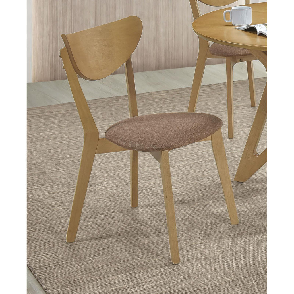 Choose the versatile design rooted in mid-century modern motifs and a breezy island vibe in your casual kitchen or compact dining space. This set of two dining side chairs is built of Asian hardwood and various wood products with a light walnut finish. A charmingly clean aesthetic delivers sweetly splayed legs, a curved backrest, and light brown upholstered seat cushions. Angled seat cushions with extra foam padding allow superb comfort. Make a signature design statement with your choice of these chairs.
