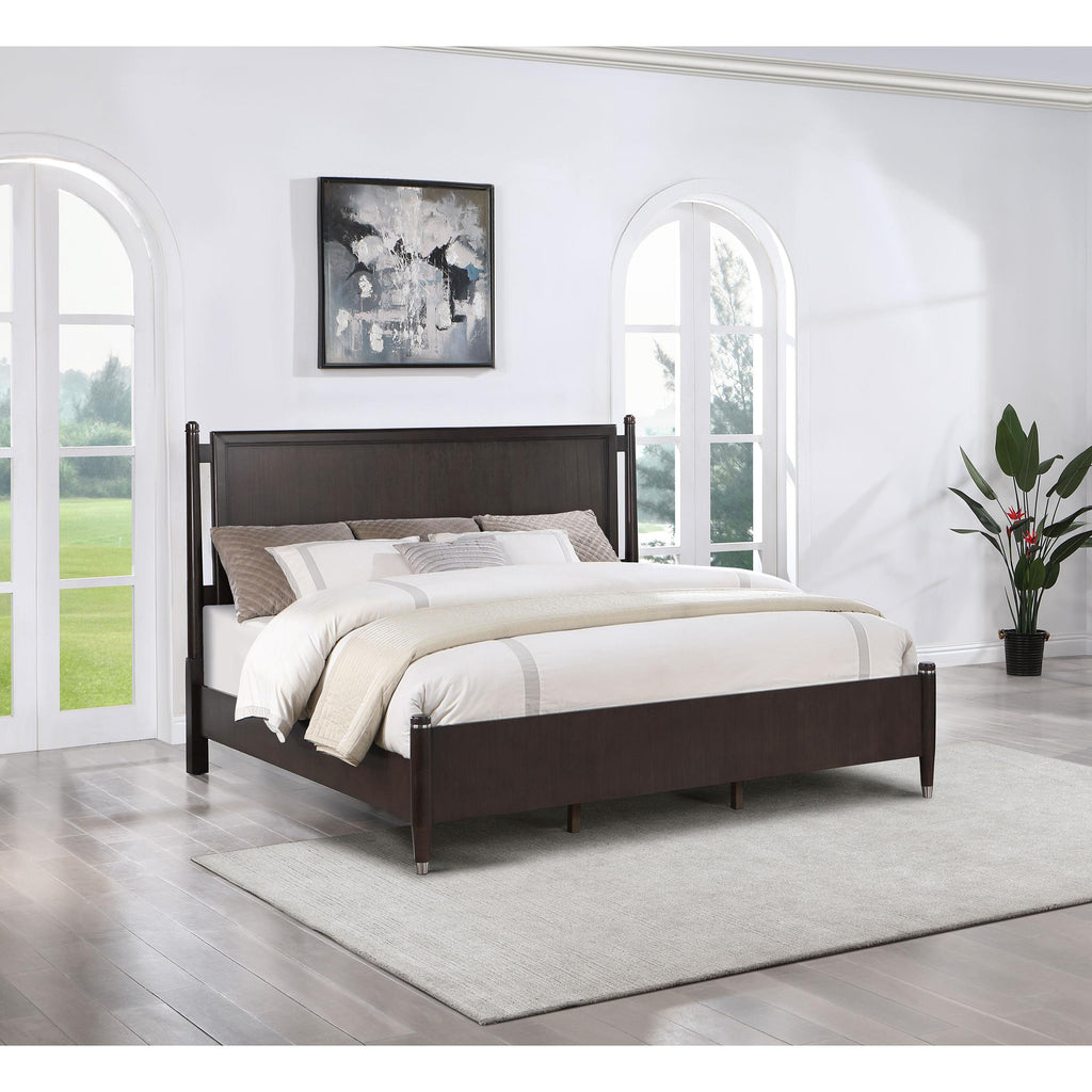 Establish a chic focal point to center your bedroom with a modern four-poster bed. Beautifully crafted in wood, the bed features a sleek silhouette with a rectangular headboard and ultra-low profile footboard that create an open feeling despite the tall posts. The bed receives a deep brown finish, highlighting wood grain details and offering a rich, neutral palette in your bedroom. Each post is tall, with a slim, tapering silhouette and a metallic accent at the top that adds character and contrast. Add beautiful linens and a selection of pillows create a cozy retreat from the world.