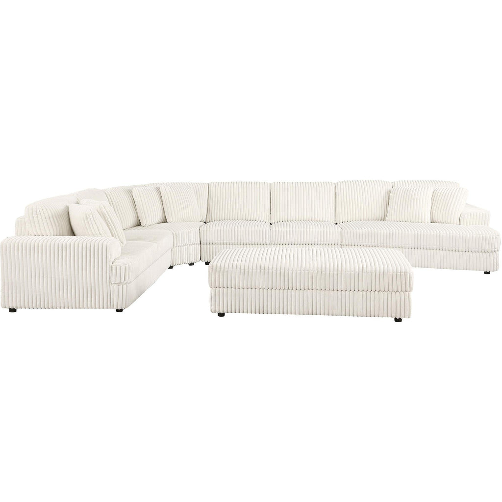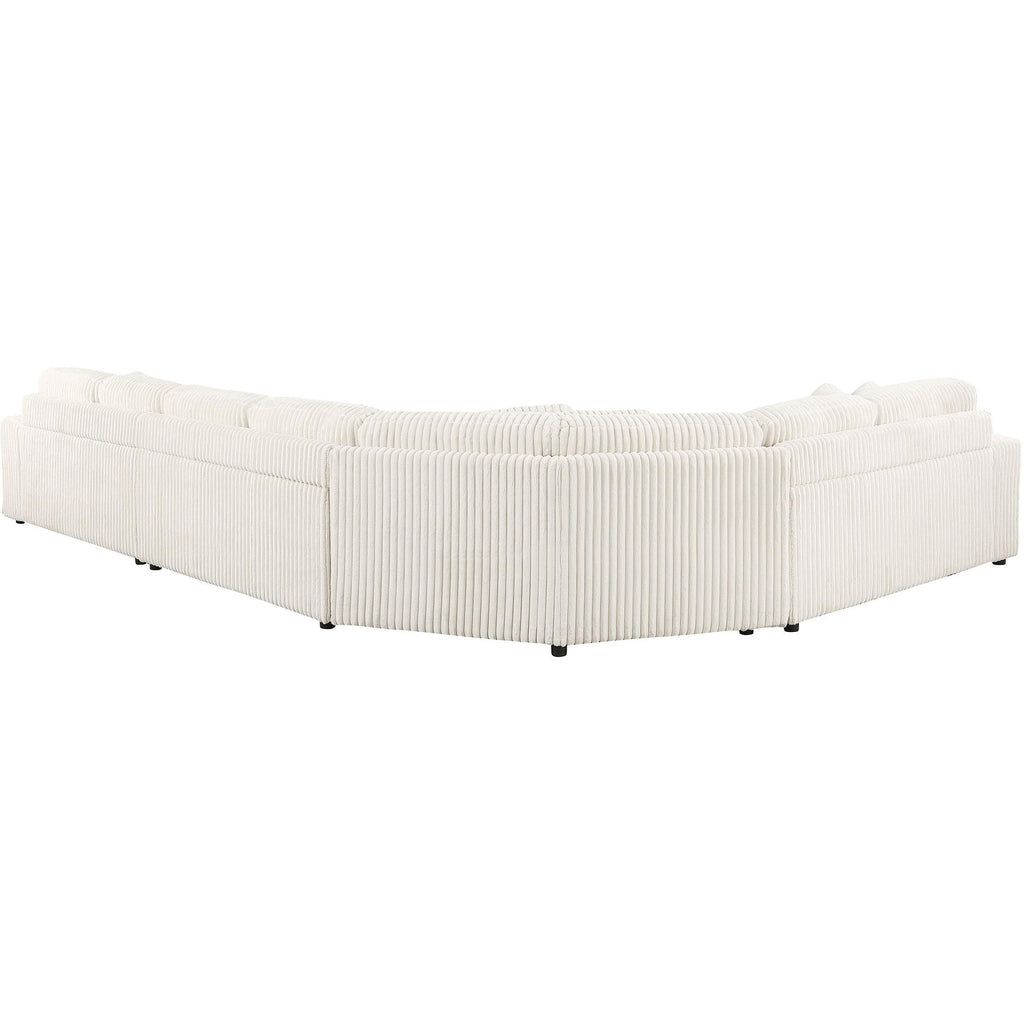 Transform your living space into a haven of comfort and elegance with our luxurious ivory wide corduroy five-piece sectional sofa with ottoman set. Designed to provide ample seating for large families or entertainment gatherings, this grand-scale sofa set exudes plush, fur-like softness. Upholstered in luxurious ivory wide corduroy, it offers an exceptionally soft and inviting texture, mimicking the feel of fur for a cozy and warm seating experience. The versatile storage ottoman provides convenient hidden storage and additional seating or leg support for ultimate relaxation. With attached seats for a tidy appearance and reversible back cushions for even wear, this sectional is perfect for any spacious living area, ensuring comfort and style for all.