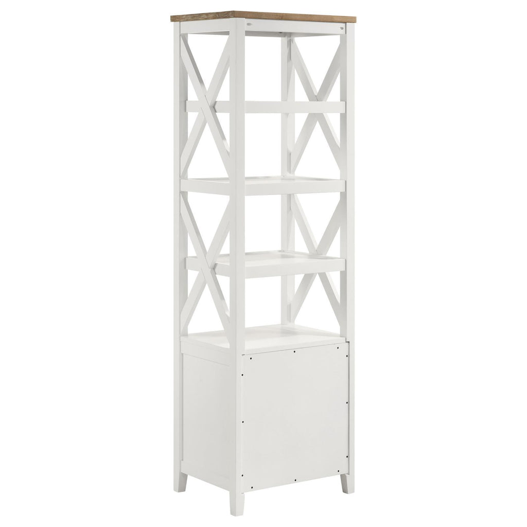 Spacious or compact, a casual living space has storage needs, and this wood media tower is a solid choice. Organize books and implements neatly while adding a fresh, inspiring look to a living room or family room. This modern tower is a mix of cottage-style, coastal, and rustic farmhouse, offering a superbly versatile fit. White finish wood construction features a four-shelf open bookcase above a two-drawer storage unit with full-drawer extension glides, as an eye-catching geometric look places X-shape elements on each side of its open bookcase. A brown finished ash veneer top changes up the style to add even more design flexibility.