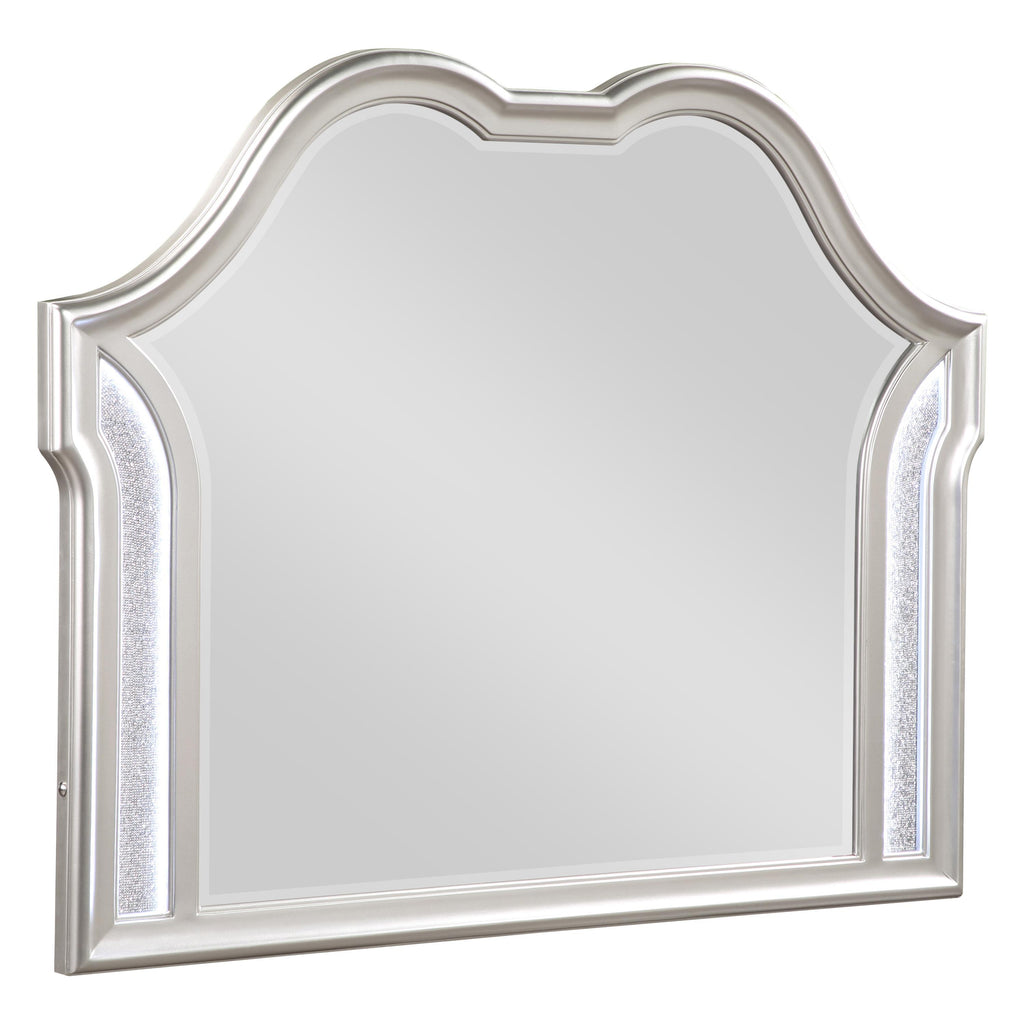 Complete your primary suite with this stunning, glam bedroom set, featuring a lovely platform bed, nightstand, dresser, and mirror combo in a gorgeous silver oak finish with glittering accent panels. The platform bed boasts a beautiful double arch headboard and matching footboard, designed with a channel tufted, foam padded insert upholstered in a soft, ivory fabric that invites you to lean back and relax. Soft, grey, felt-lined top drawers in the dresser and nightstand keep delicates protected, while the nightstand offers a built-in USB port to keep handheld devices charged as you prepare for the day. Slender hexagon-shaped hardware with pearlescent accents adorns each of the curved drawer fronts, allowing you to grab items easily. A double arch framed mirror with a timeless beveled edge offers a contemporary flair and sleek attention to detail.