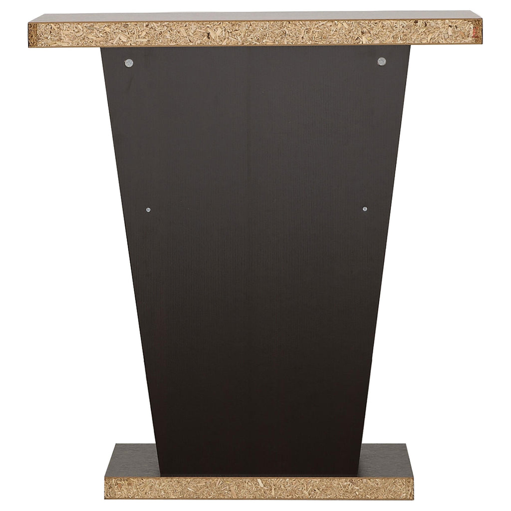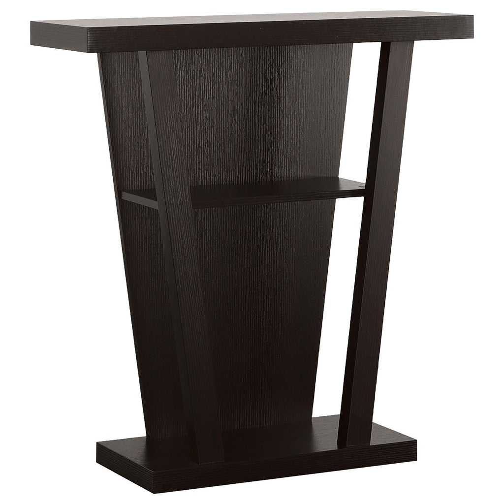 Angular in shape, this console table offers a dynamic design meant to impress. Dress up a transitional room with a space for displaying books, decor, or potted greenery. Luscious cappuccino offers a bold, dynamic finish. An eye-catching slanted silhouette creates a visual treat. Add this console to a central living space or an entryway.