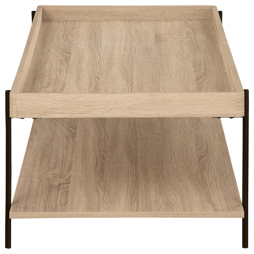 Offer a casual ambiance to your living room gathering space with a modern farmhouse coffee table, constructed from metal and engineered wood. It showcases a light brown wood grain finish, creating a sense of dimension while maintaining neutral versatility. The tabletop is rectangular, with a tray-like top that adds detail and natural wood-like features. A minimal metal framework receives a black finish and offers structure and support. Underneath, a full, flat lower shelf provides convenient storage or display space for books and decor, lending personalized appeal to your living room.