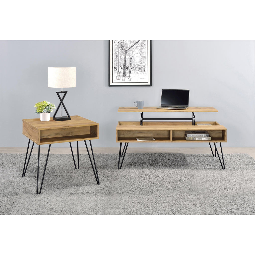 This square end table is as functional as it is stylish, featuring an open shelf for convenient storage. Made from engineered wood with a golden oak scratch-resistant, eco-friendly laminate veneer, this table ensures durability for everyday use. Its compact size and sturdy black hairpin legs make it a versatile addition to small spaces or as an accent piece. The warm finish and clean lines create a timeless, modern look for any room.