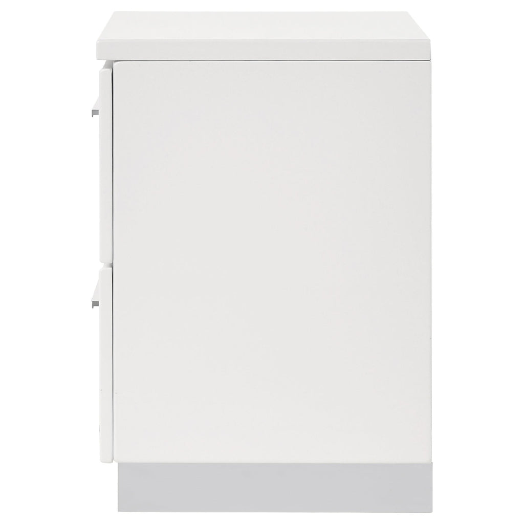 Tasteful and refined with a modern edge, this nightstand will instantly upgrade your bedroom's decor. Coated in white polyurethane with a high-gloss finish, it exudes cool, contemporary glamour. It comes complete with two large drawers for versatile storage. High-shine chrome adorns its handles and base supports, elevating its exquisite charm. Ideal for bedrooms of all shapes and sizes, this nightstand exudes elegant versatility.