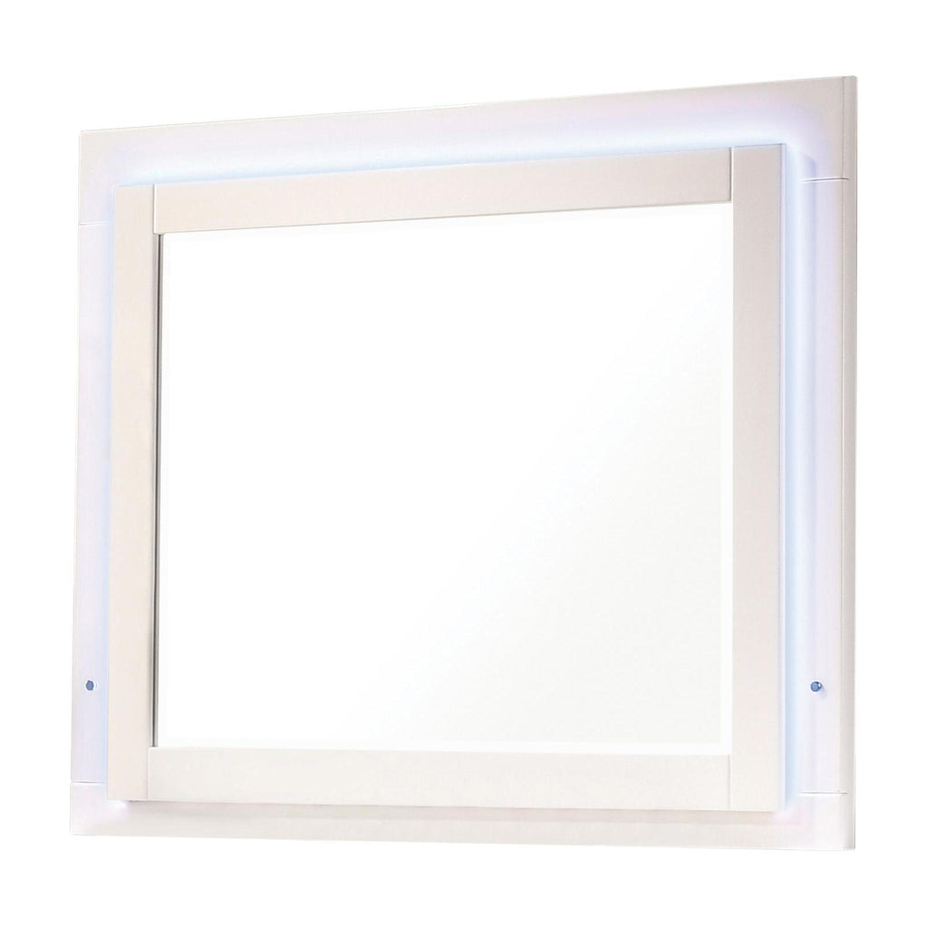 This collection features an exquisite contemporary design with high end white polyurethane coated and polished to a high gloss finish. With polished chrome metal pull handles, spacious storage drawers, this set is sleek, crisp, and modern. This set includes headboard, footboard, rails, dresser, dresser mirror, and nightstand.