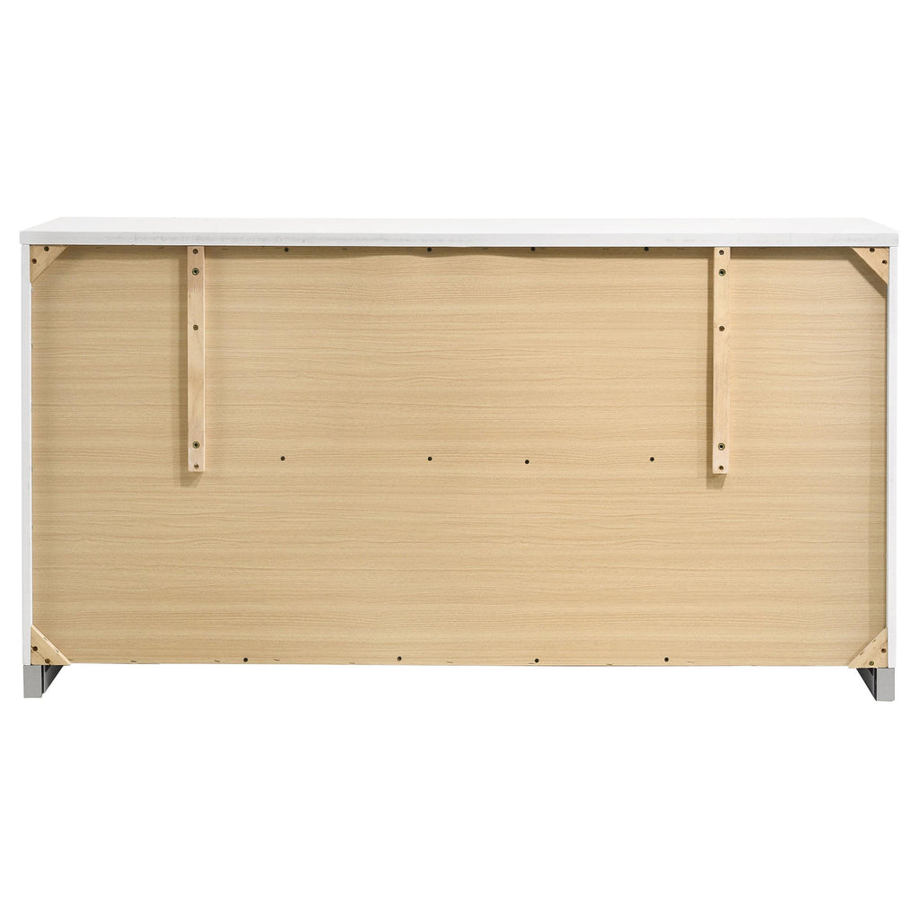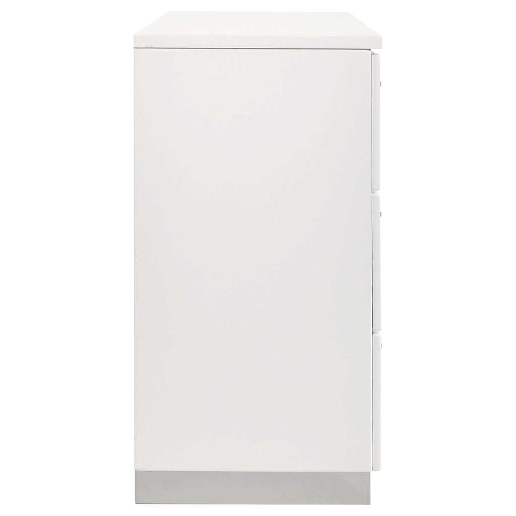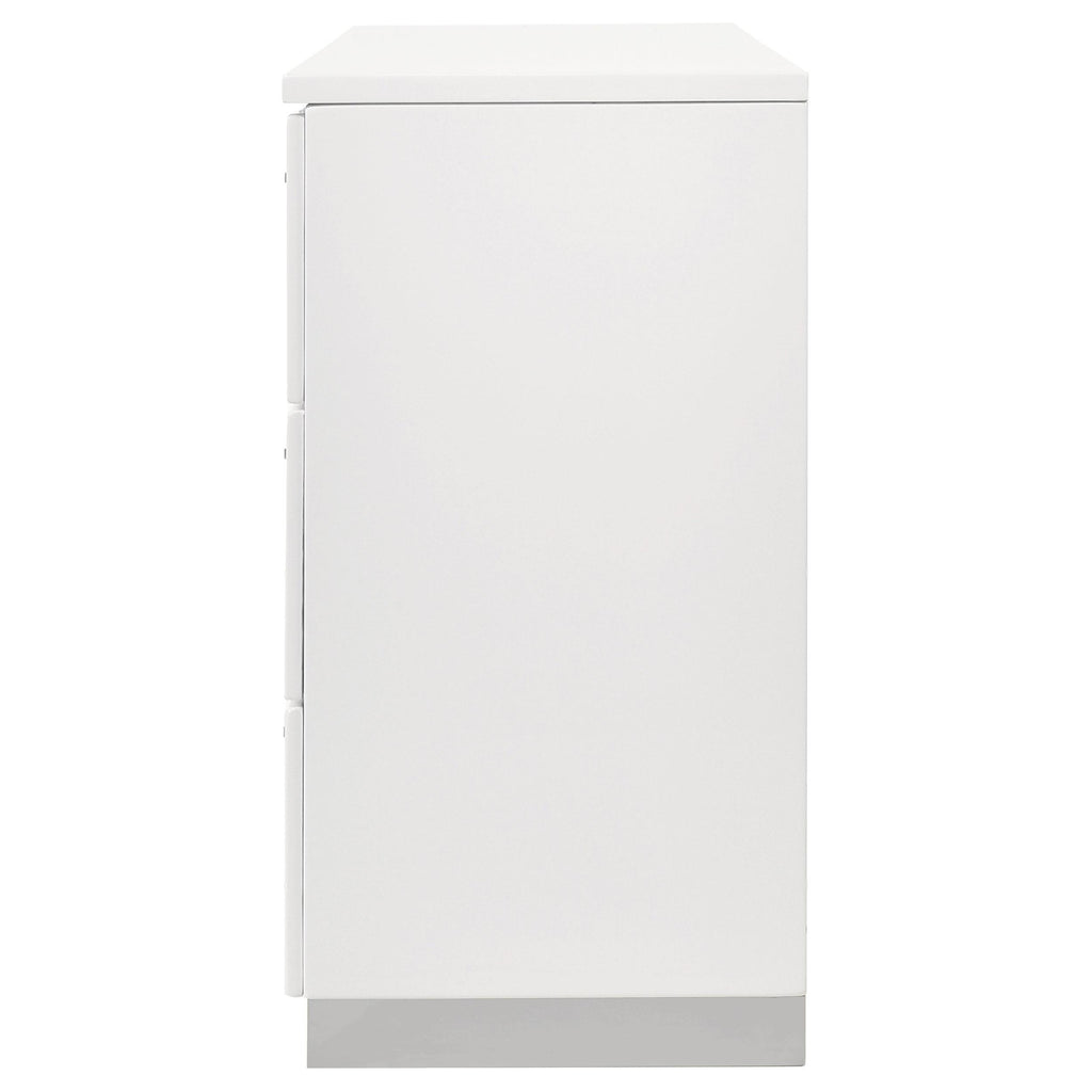 Organize your clothing collection in style with this sleek, chic, modern dresser. Its cool, contemporary design adds a touch of elegant simplicity to any bedroom. Six spacious storage drawers keep your wardrobe safe and secure. Constructed from wood with a high gloss white finish, its glamorous silhouette is thoroughly pleasing to the eye. Whether it's placed in a guest room or master suite, this dresser is an excellent option to meet your storage needs.