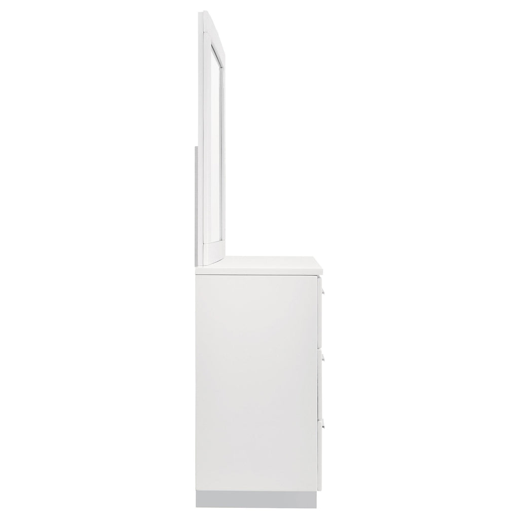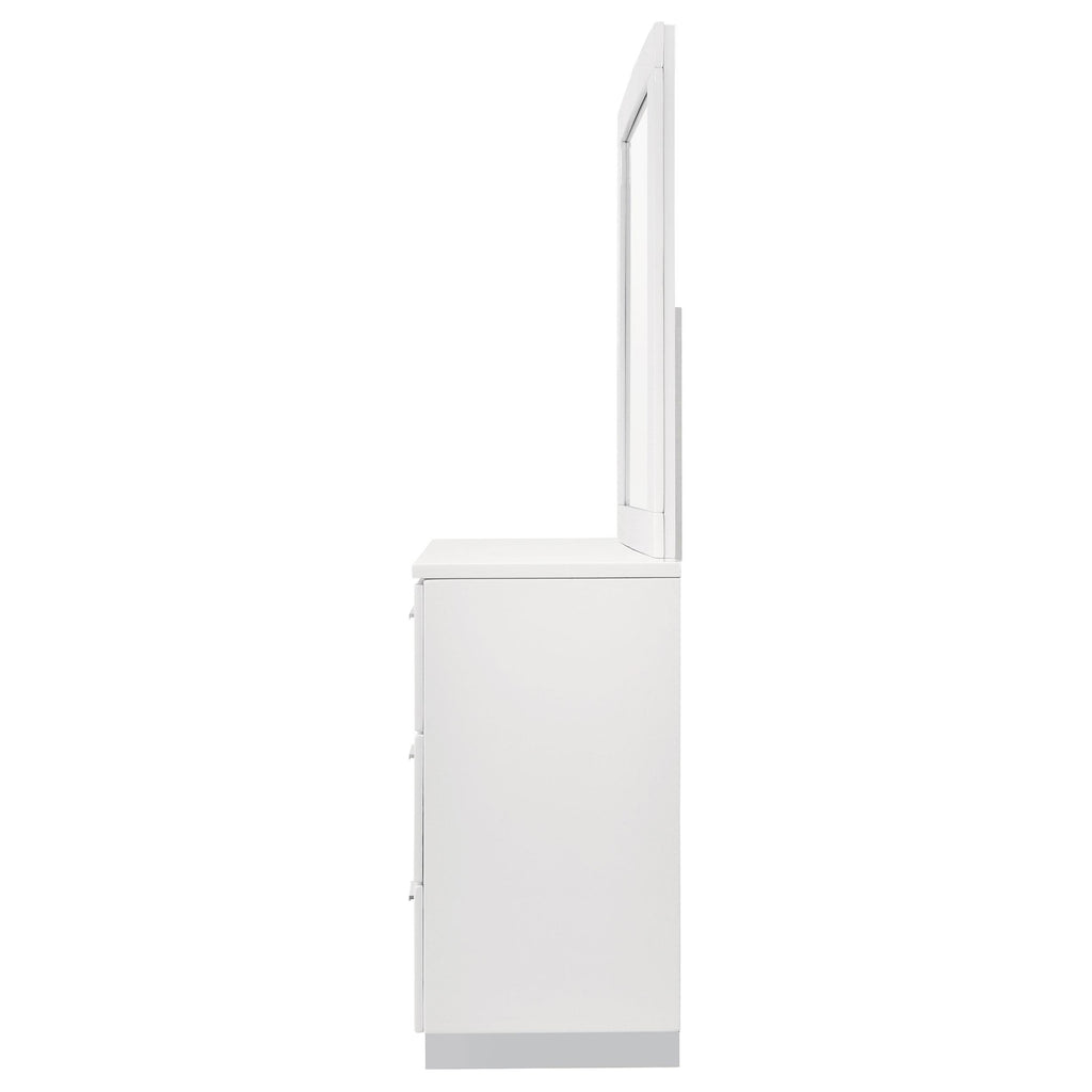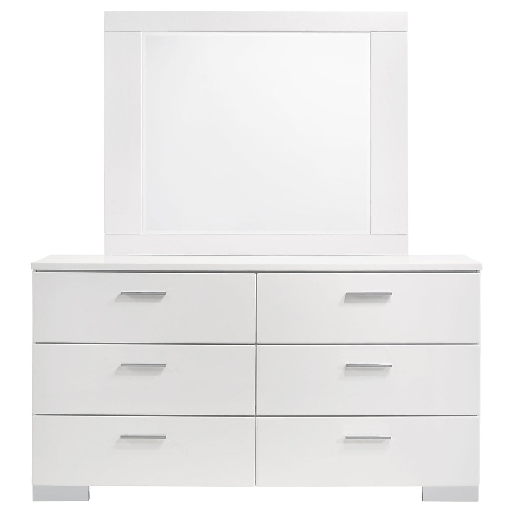 Embrace the elegance of modern design with this sleek, chic dresser and its stunning rectangular mirror. The dresser, in a high gloss white finish, offers six spacious drawers for organizing your clothing collection with style. Its contemporary design adds a touch of simplicity to any bedroom, making it a great fit for guest rooms or master suites. The accompanying mirror, with clean lines and a polyurethane-coated high gloss finish, creates a bold statement and adds dimension, refining the room with its sharp angles and charming reflective hues.