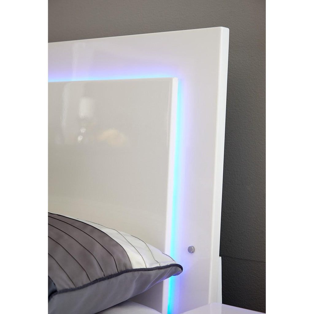 Cosmopolitan style infiltrates a favored bedroom. With a total mod and glam personality, this stylish bed is fully contemporary. Enjoy a low-profile with a white coated and polished glossy finish. Blue LED lighting radiates from its headboard to aid in reading without glare. Style a fresh, elegant room with this spectacular bed.