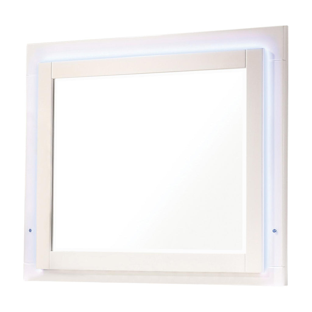 Add ambiance to a dressing area of bedroom with this modern vanity mirror. LED lighting offers a cool under glow tucked between a dual framed mirror. Covered in a polished, glossy white finish throughout, this glam mirror lends a stunning, chic display set atop a matching dresser. Clean lines and a rectangular shape provide an unobscured, wide reflective surface to assist makeup applications, hair styling and so much more. With its neutral white tone, it can complement many bedrooms' existing color palettes.