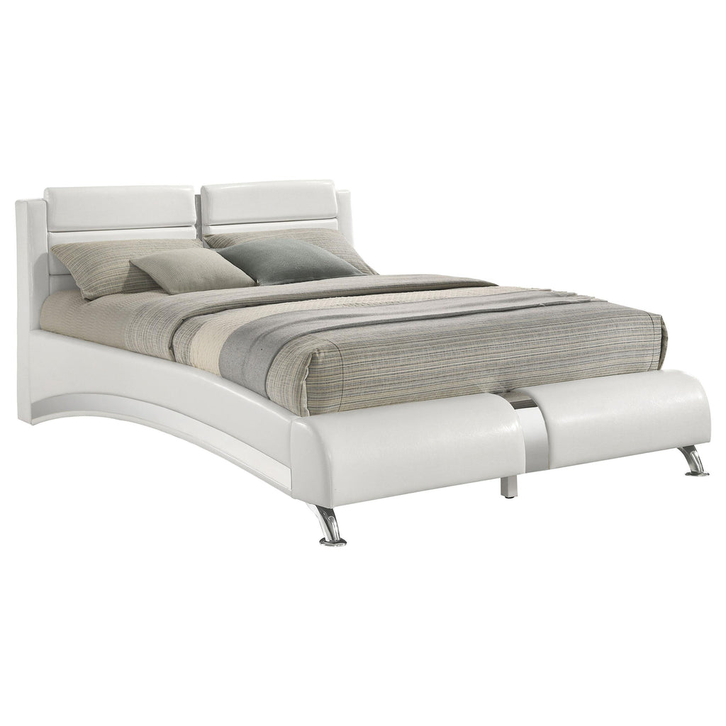The Jeremaine collection presents this well-designed bed with a touch of class. It features straight lines and sumptuous curves for a contemporary allure. The headboard is fashioned with cushioned paneling for a unique look. The bed is stunningly finished in coated polyurethane that's polished to a high gloss. The chrome-like accents give this bed an exquisite appeal fit for any modern bedroom.