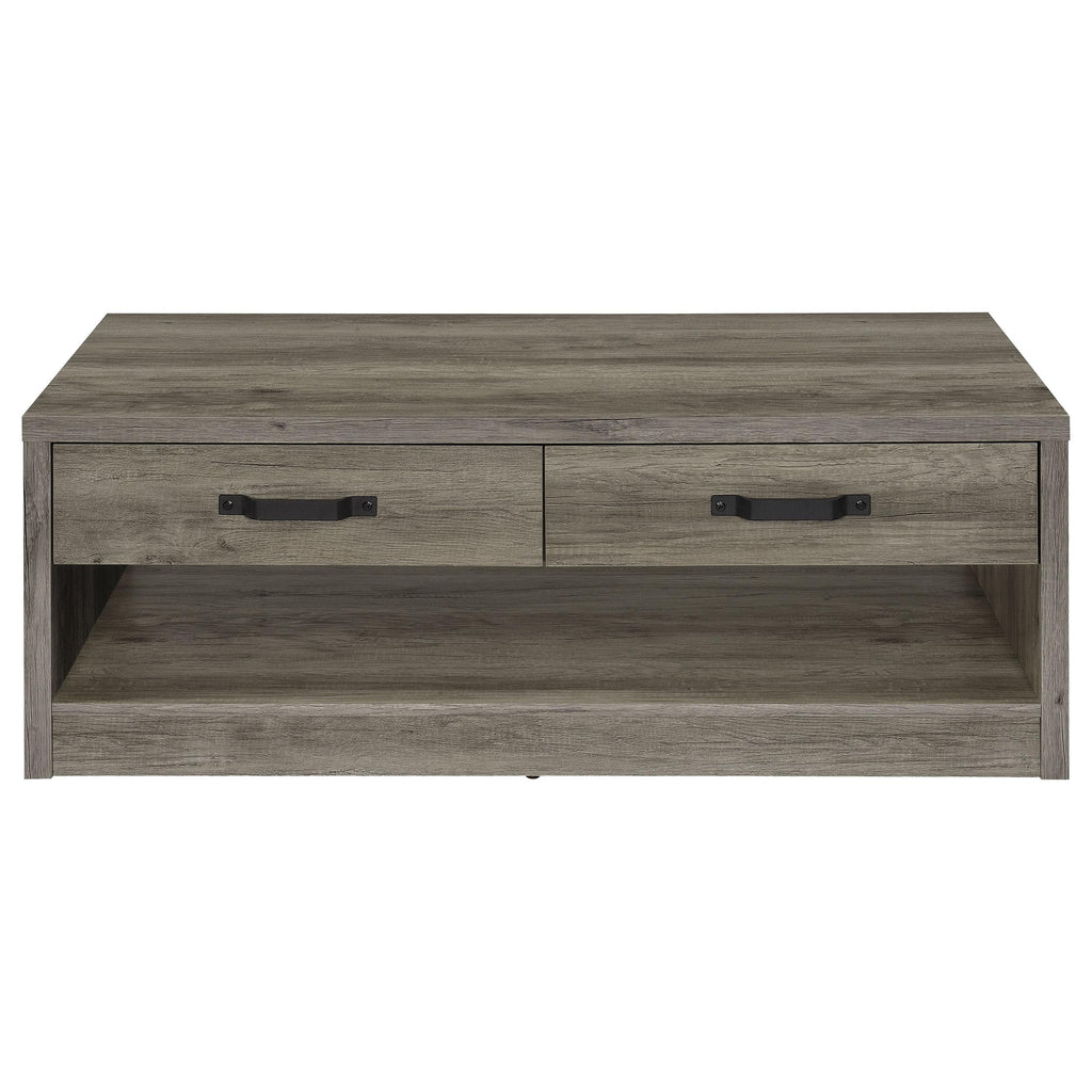 Enhance your living space with this rustic yet contemporary coffee table. Featuring a gray driftwood finish over engineered wood and scratch-resistant veneer, it boasts a natural wood-look design with realistic grain accents. The table includes two drawers with black metal handles for accessory storage and an open shelf for added utility. Its clean rectangular silhouette blends seamlessly into modern interiors, offering both style and functionality for everyday use.