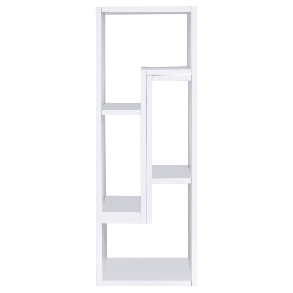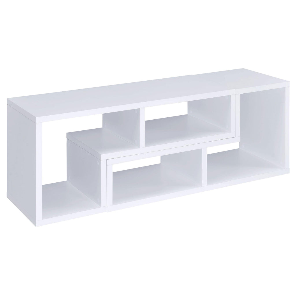 Perfect for a variety of uses, this two-piece bookcase and TV console is fabulously versatile. It allows you to switch between various bookcase and TV stand configurations for your convenience. Bold, L-shaped shelves are arranged in striking geometric designs for a modern look. A white finish enhances its contemporary appeal. Crafted from top quality materials, this bookcase is sturdy, stylish, and smart.