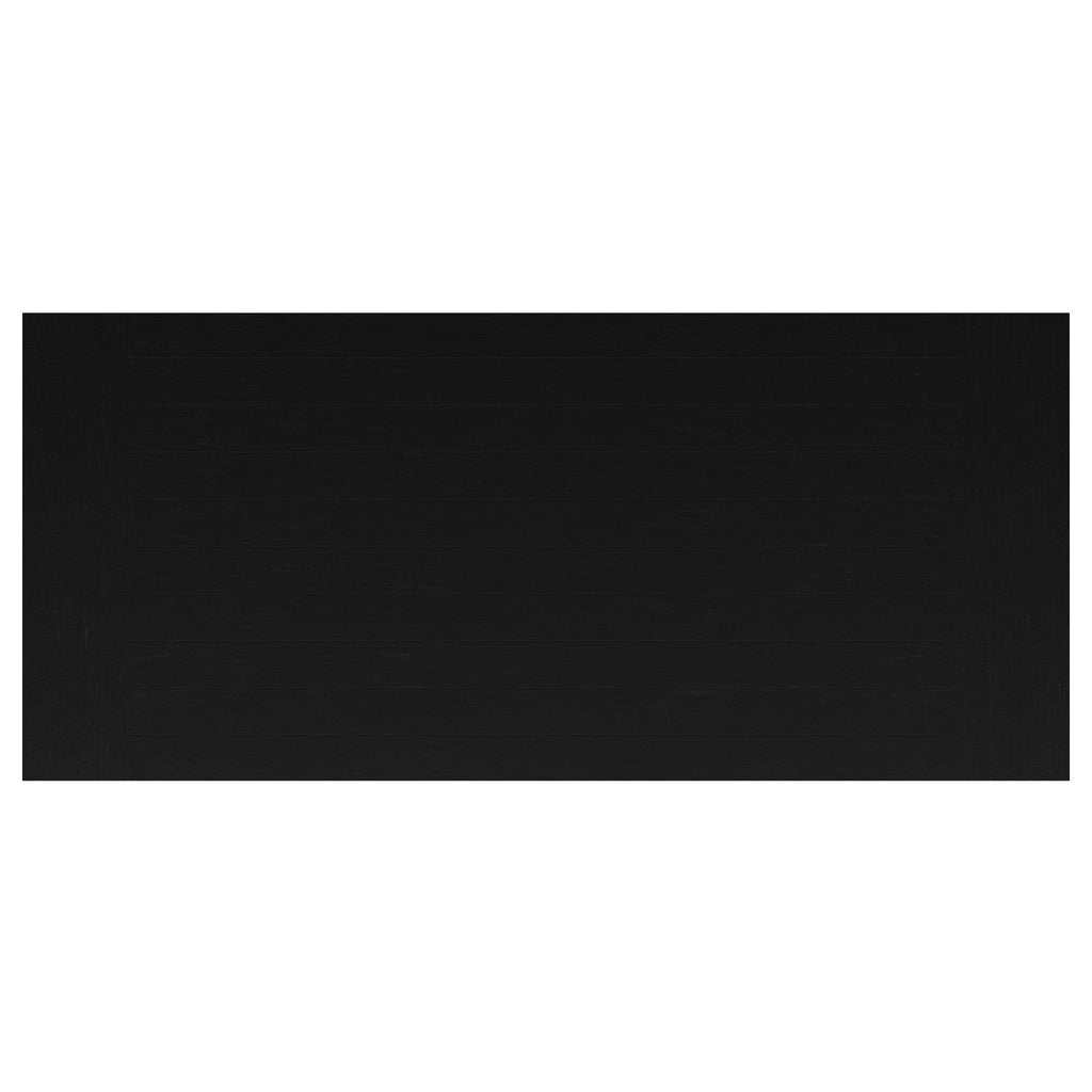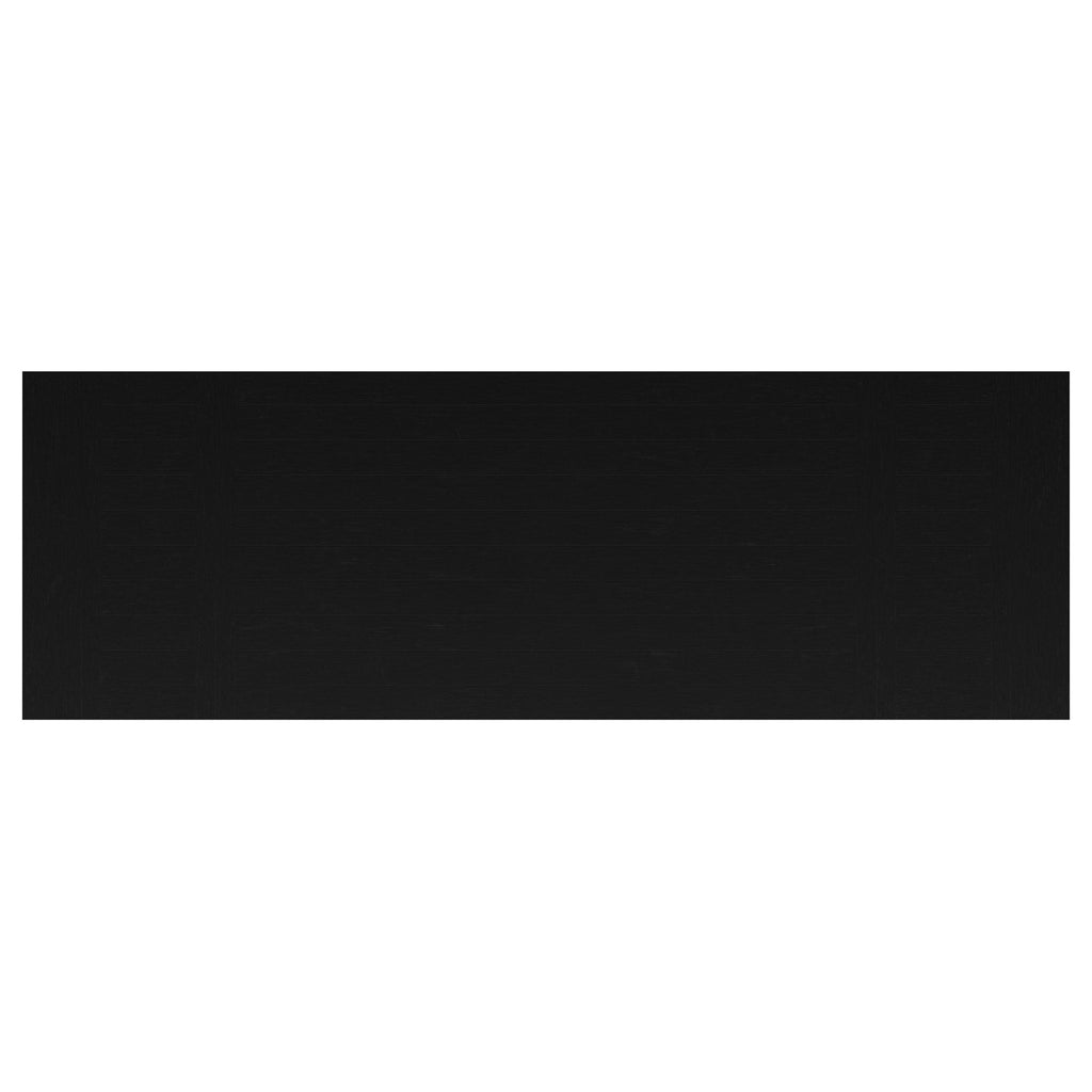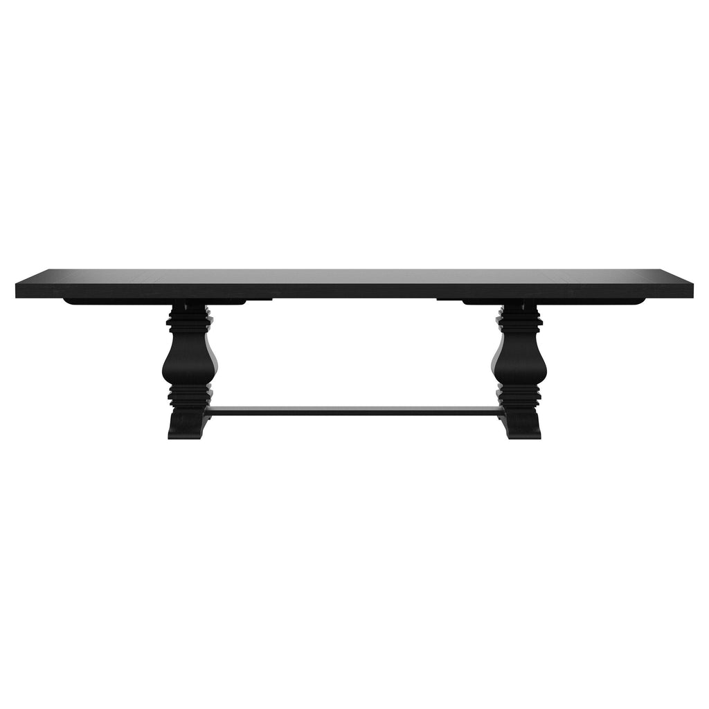 A double pedestal trestle base bring romantic charm and timeless character to a transitional dining table. The rectangular table is perfect for a family dining room, offering casual appeal with plenty of refined flair. It showcases an antique black finish that's deep and rich, perfect for adding a little drama to your dining space. The carved style double pedestals are unified with a wide plank accent, creating an artisan look and feel. Its plank style tabletop includes a removable leaf, easily expanding the tabletop for family or cherished guests.