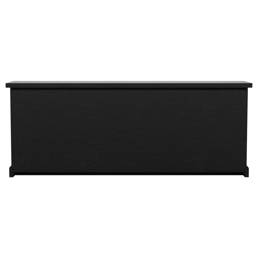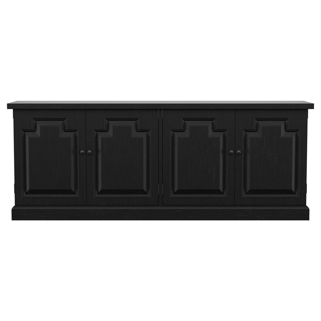 Appreciate the decorative door fronts on a charming transitional sideboard. Offering easy storage and organization, it's a perfect choice for your dining room. It even has the versatility to act as a console or credenza elsewhere in your home. It shows off a deep antique black finish, with a wide top ideal for decor or serving meals at holiday gatherings. Four decorative doors add dimension to the look, while opening to reveal drawer and shelf storage perfect for organizing all your accessories.