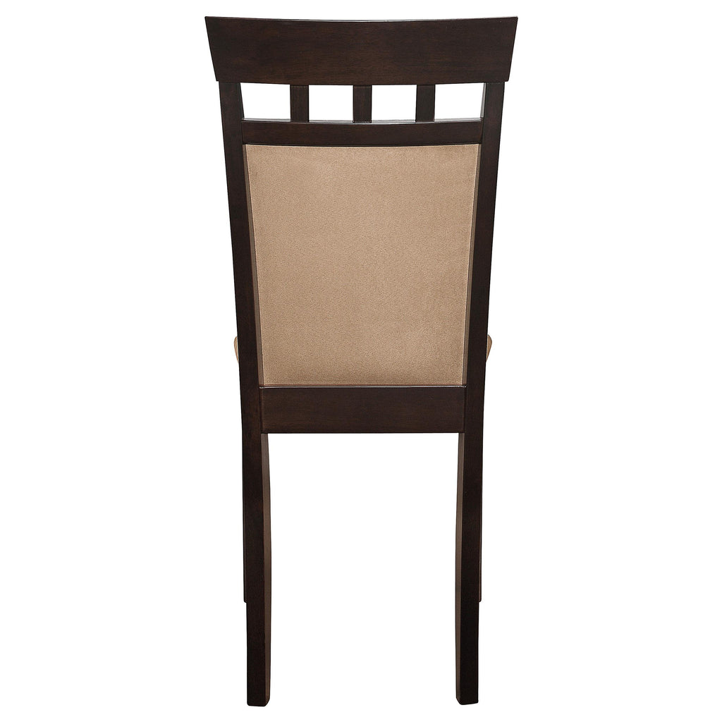 Infuse your dining area with casual glamour and elegance. This stately wooden chair is classy, comfy, and stylish. Its smooth, sleek frame boasts a rich cappuccino finish and intriguing cut-out designs. Its seat and back feature soft padding and luxuriously soft, tan fabric. With a tall, wide back offering sturdy support, this chair provides endless hours of comfortable lounging as you connect with loved ones over a homemade meal.