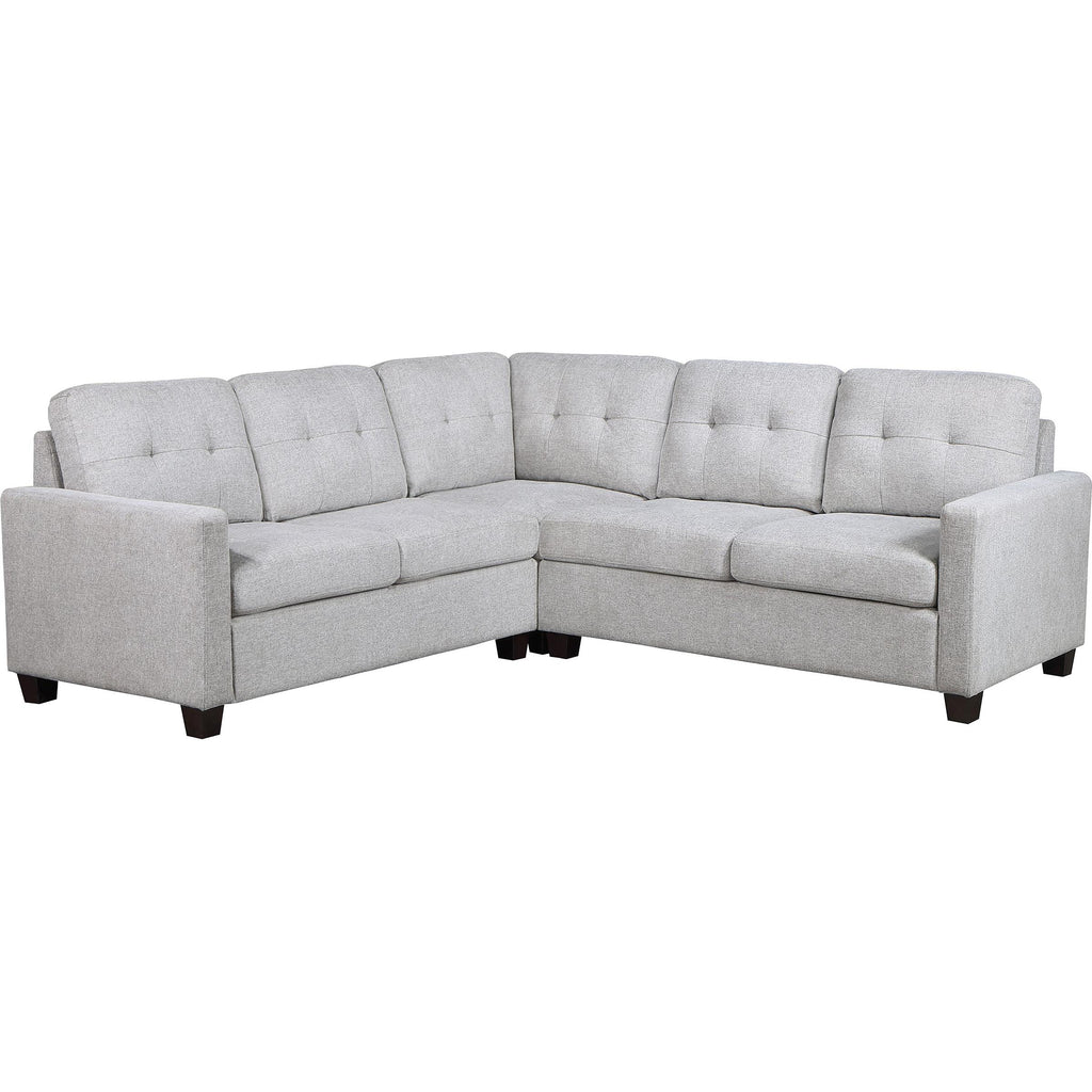 Entertaining is a breeze with a transitional style motif as the sectional set assembles pieces forming an L-shaped sofa, ideal for family rooms and media venues. Classic design elements are pleasing, as wood framing forms a straight box base and slender track arms. Gorgeous fabric upholstery opens up options for blending with room color palettes. Sit in relative luxury on foam-padded attached seat cushions and against reversible back cushions, all with subtle tufting. Chunky wood feet deliver a fun iconic embellishment to a set that includes one corner chair, one left-facing loveseat, and one right-facing loveseat.