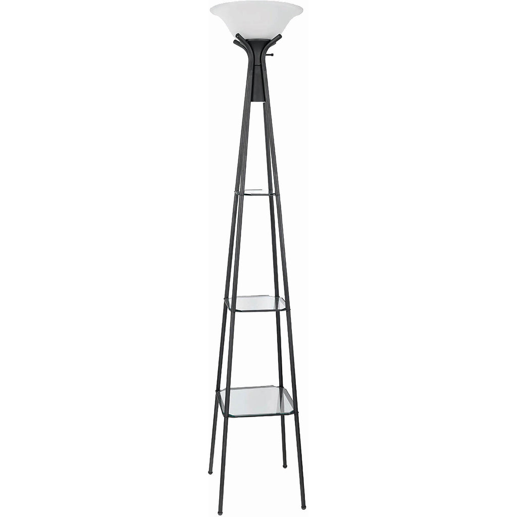 Explore the depths of modern geometric style. With a graceful silhouette, this floor lamp plays up a contemporary theme with a hint of softness. A tapered tower shape body shows off a charcoal black finish, embellished with clear glass shelving at each level. A frosted glass shade and additional down light put finishing touches on this intriguing design. Operates with a three-way switch.