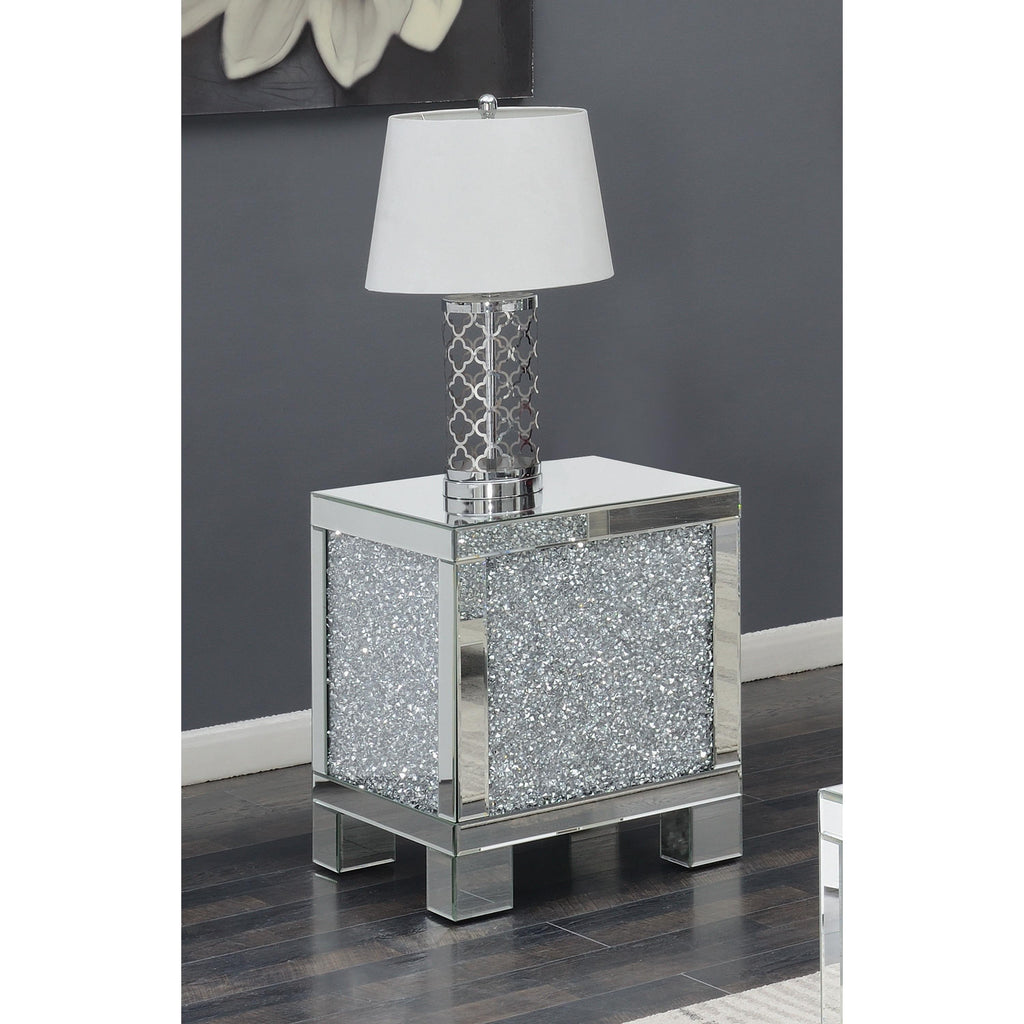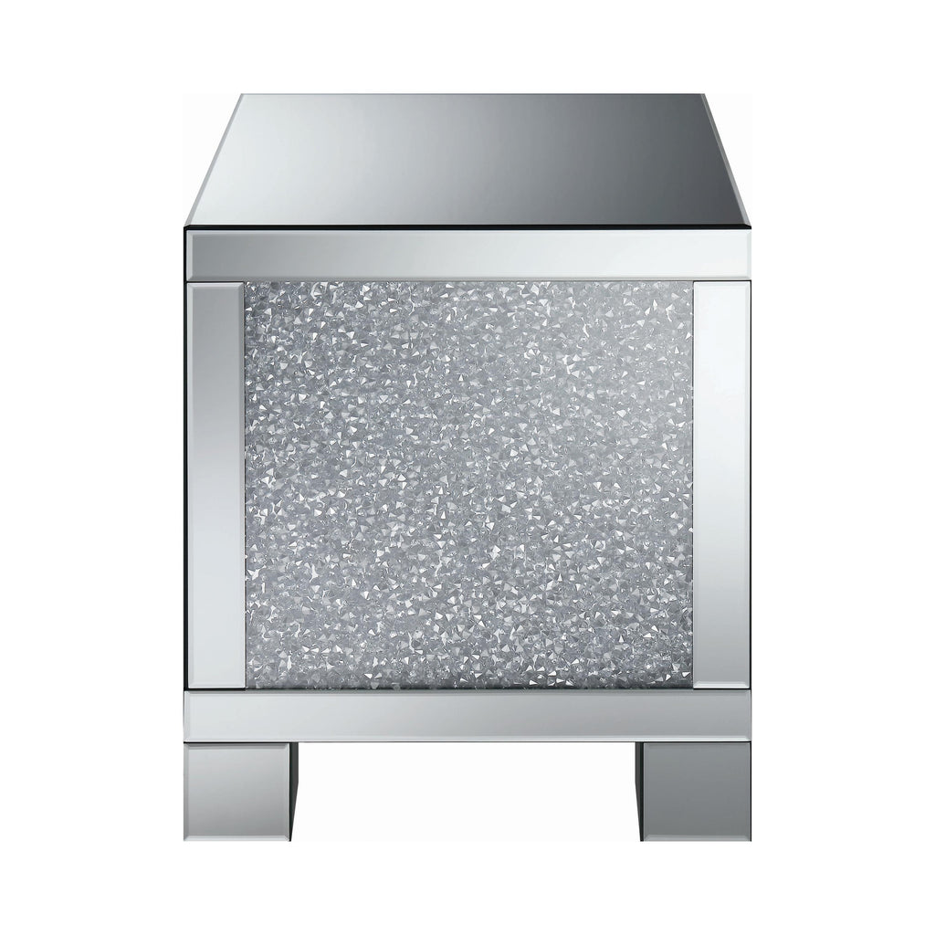 This 20-inch square mirrored end table brings a touch of glam to any space. Its engineered wood frame is adorned with shimmering acrylic crystal accents, adding sparkle and elegance. Fully mirrored surfaces enhance light and dimension, while the clean, square silhouette delivers sleek, contemporary style. Perfect as a functional or decorative piece, this table elevates your living room with luxurious glamor.