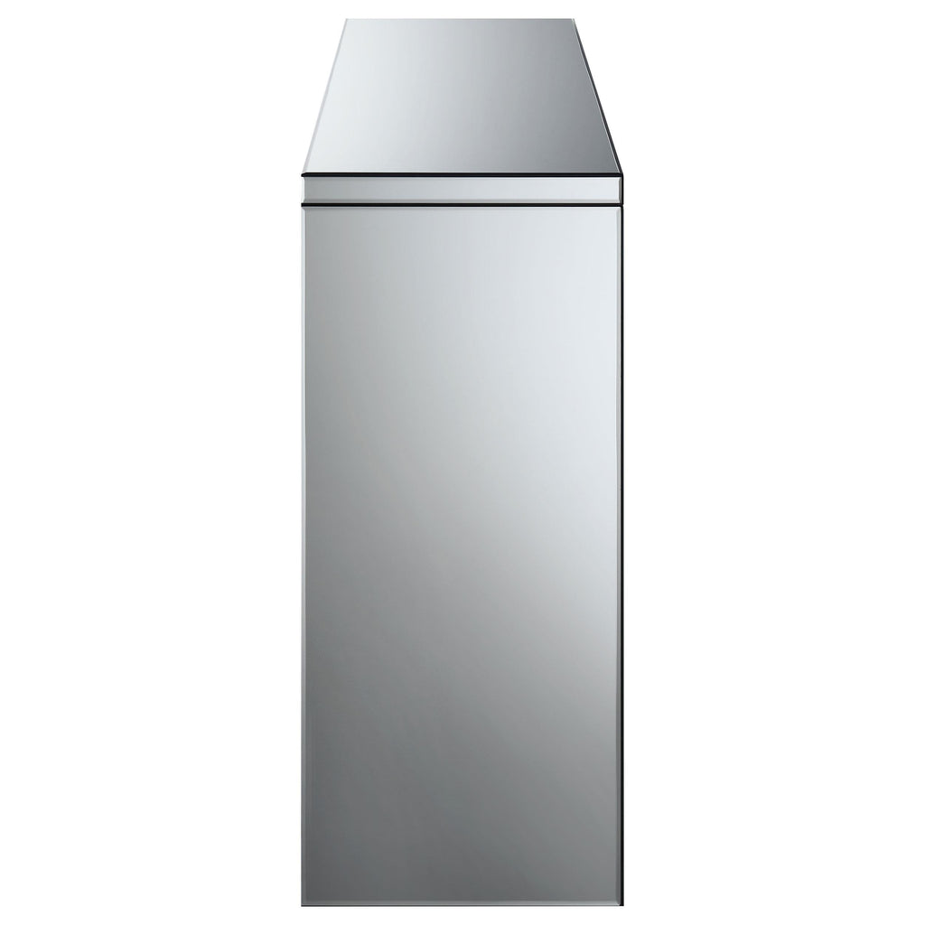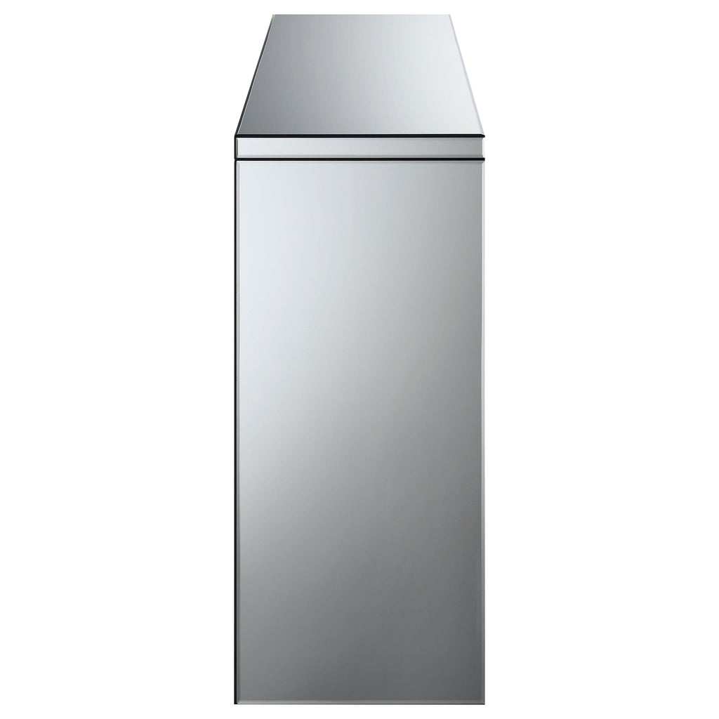 This mirrored console table features clean lines and a contemporary design, highlighted by a central inlay of sparkling acrylic crystals. The sturdy frame and smooth mirrored surfaces create a striking, modern aesthetic that elevates any room. The acrylic crystal accent is placed seamlessly within the design, adding a touch of glamour. With its sleek and minimalist structure, this console is perfect for entryways, living rooms, or hallways, offering both beauty and functionality.