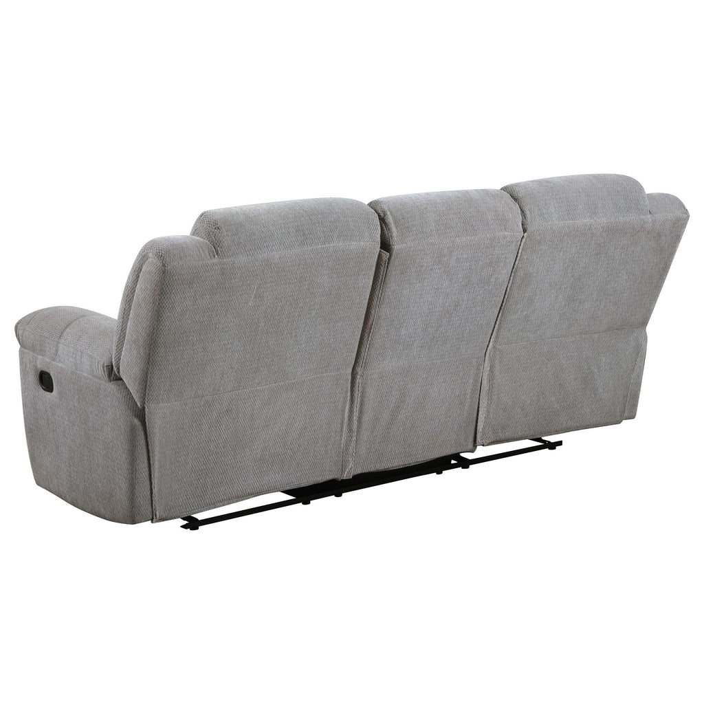 Take a relaxed and laid-back approach to seating with our manual reclining sofa, designed for ultimate relaxation. Wrapped in soft textured grey chenille fabric, this sofa offers a plush and inviting feel that enhances any living space. The manual recline feature allows you to adjust your seating position for optimal comfort, whether you're watching TV, reading a book, or simply unwinding. With pillow top arm supports providing extra comfort, this sofa is the perfect addition to your home for stylish and cozy relaxation.