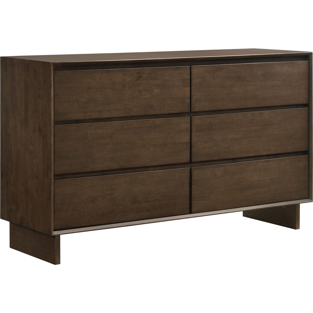 Create a handsome, refined space for rest and relaxation with this modern bedroom set. Crafted in solid wood with a warm brown finish, the set delivers a handsome bed and plenty of storage for clothing and accessories. The nightstand provides a perfect spot for a reading lamp and a great book. The dresser includes a framed mirror, adding lightness and reflectivity while providing a spot for grooming and beauty rituals. This stylish set features platform bed with a tall panel headboard and low rails, offering a refined, understated centerpiece in your bedroom.