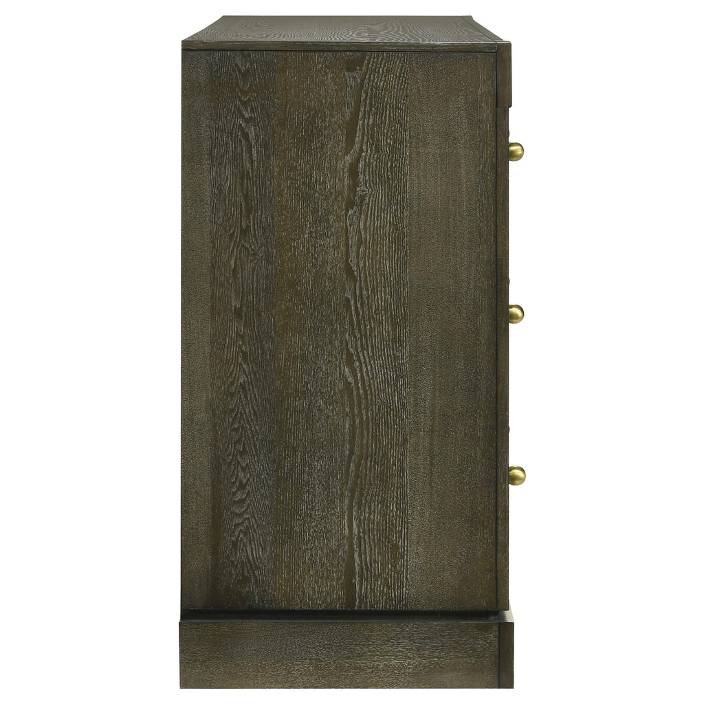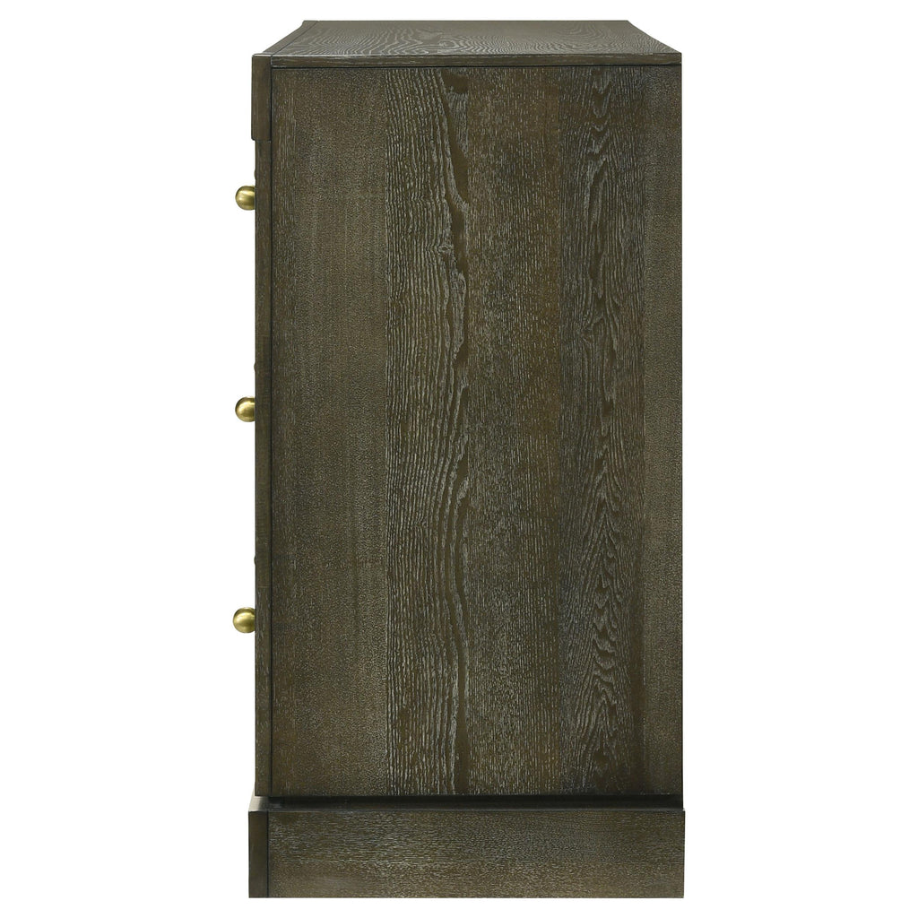 Add a touch of elegance to your bedroom with this spacious dresser, featuring a transitional design with rounded corners and trending details. The dark cocoa finish and brass knobs complement the sophisticated style, while the solid wood drawer box with English dovetail joinery ensures durability. The dresser includes felt-lined top drawers and 45mm metal ball-bearing glides for smooth functionality. Crafted from solid hardwood, ash veneer, and MDF, this dresser combines style and practicality.