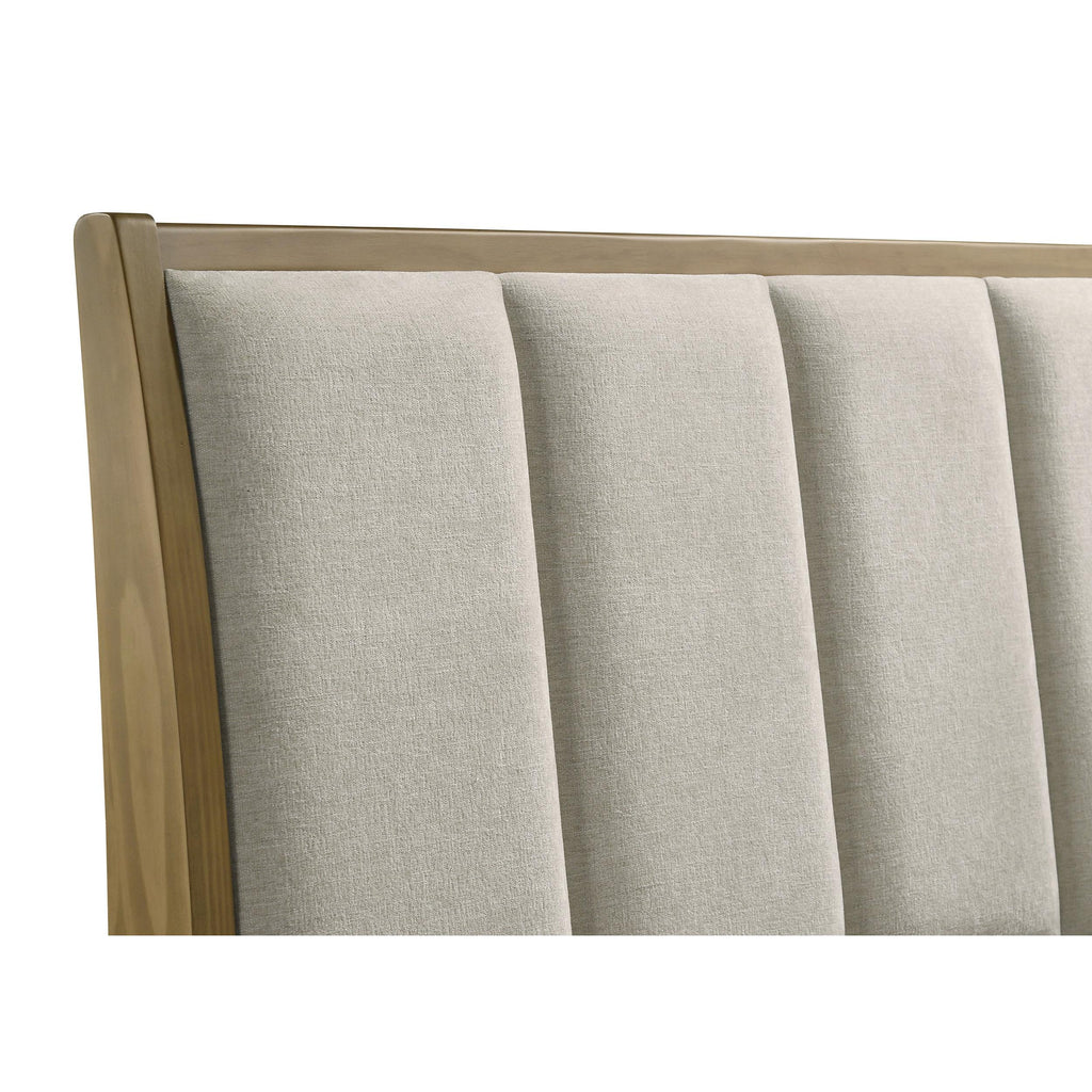 Elevate your bedroom with this bed that seamlessly blends transitional style with modern flair. The bed features a vertical channeled upholstered headboard in beige textured fabric, adding a touch of elegance and comfort. Its natural pine finish brings warmth and a sense of timelessness to your space. The wrapped rails to the footboard enhance the bed's sleek, streamlined profile. Perfect for any bedroom, this bed combines classic craftsmanship with contemporary design elements.