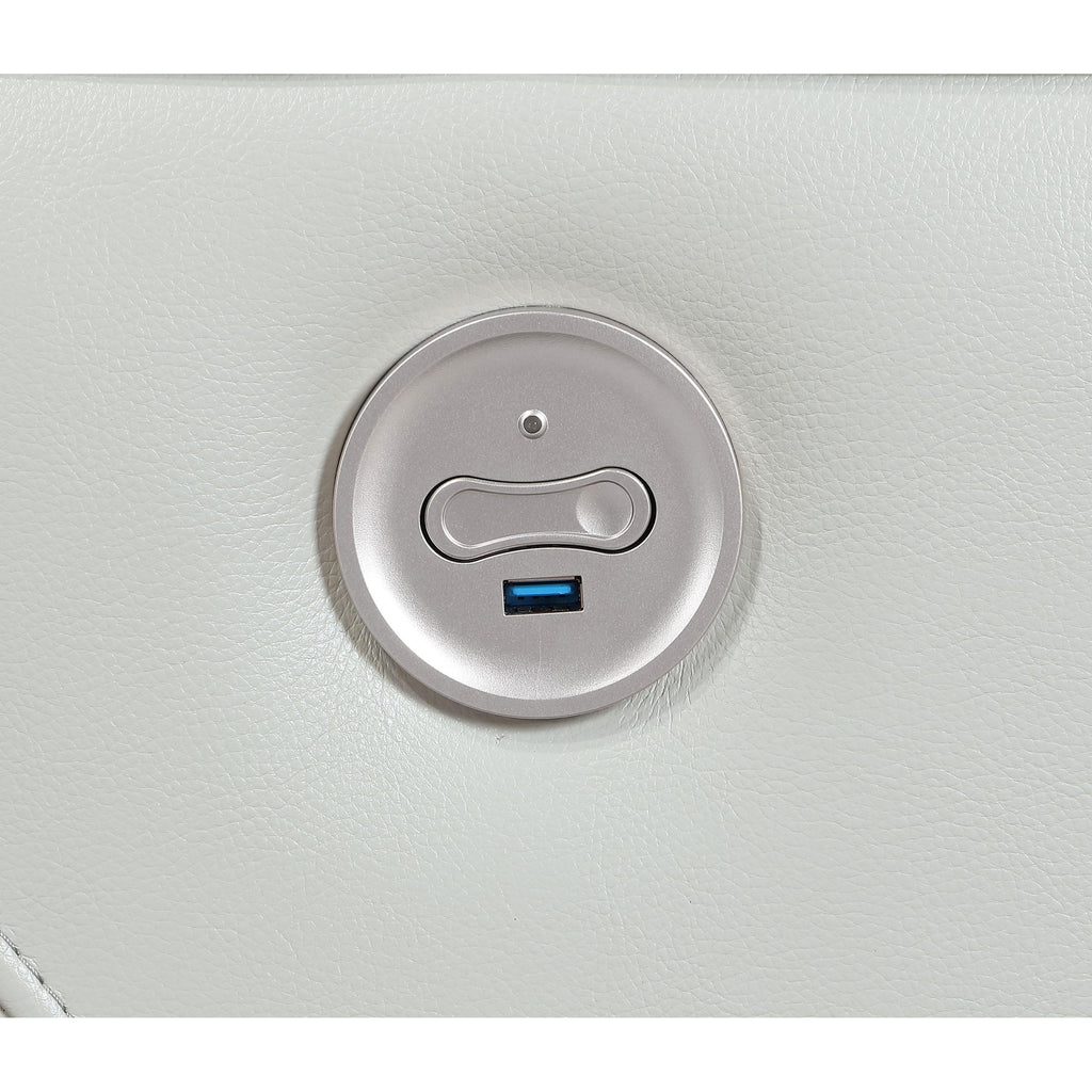 Contemporary elegance plays out in a clean, modern design as the power recliner delivers beauty and comfort to a space reserved for easy entertaining and relaxing. Dove grey leatherette upholstery covers wood framing to provide a sturdy build, embellished with plump foam fill in a tall, attached back cushion and supportive seat cushion. Subtle tufting cradles body positioning, aided in luxurious comfort by power reclining at the touch of a button on a switch panel with a handy USB port. The versatility of a clean dove grey finish joins a delightfully simple yet elegant style motif to make this power recliner a hit in any modern space. This power recliner is all that's needed for a relaxing day or evening.