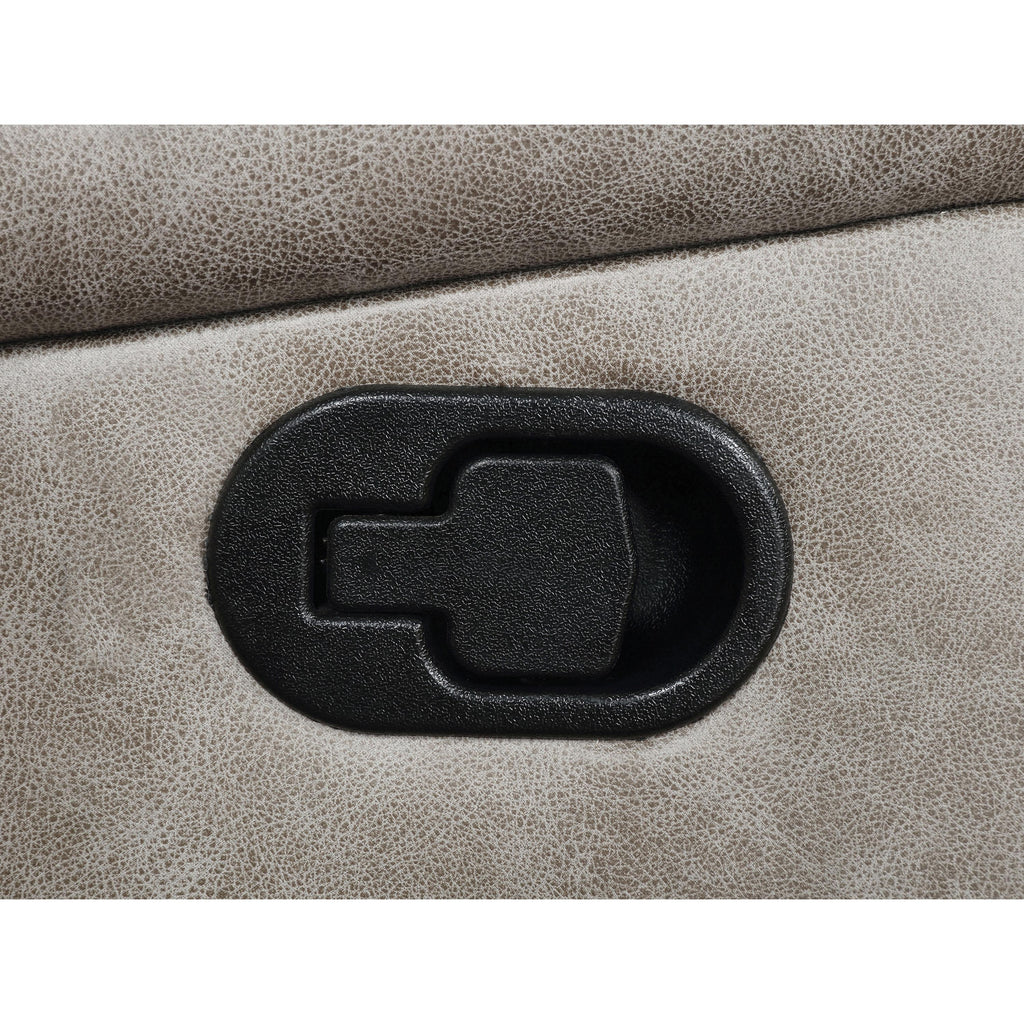 Every entertainment area deserves this glider loveseat with console. The neutral color palette makes it easy to blend with your decor. Its leatherette upholstery ensures a comfortable seating experience. A center console offers a small storage area for remotes with a lift-top container within. Find an easy place to store drinks with the built-in stainless steel cupholders.