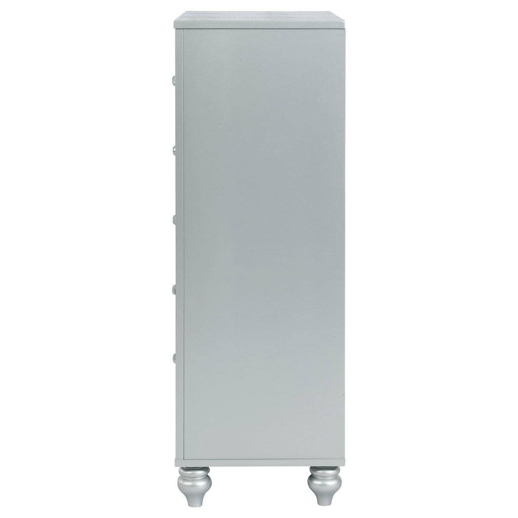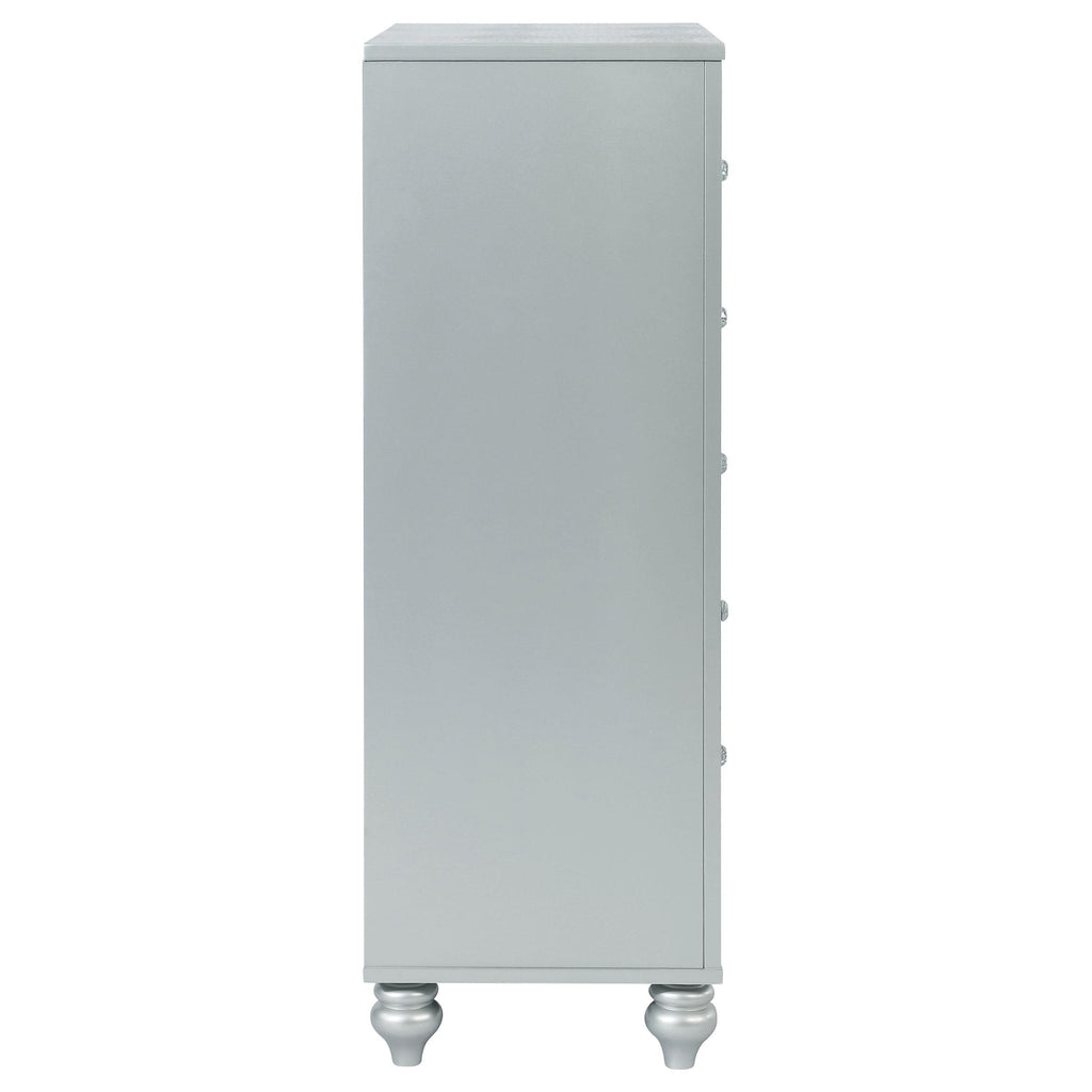 Enhance your home with a modern glam update to a classic design with this transitional five-drawer chest. It boasts a dazzling design that takes lends glitz to any modern bedroom. It comes in a vibrant silver metallic finish with fret work detail on the front panels and drawer fronts. The drawers are adorned with crystal-like pulls and the top ones are lined with black felt to protect treasured valuables. Delicate bun feet complete the design of this exquisite masterpiece.