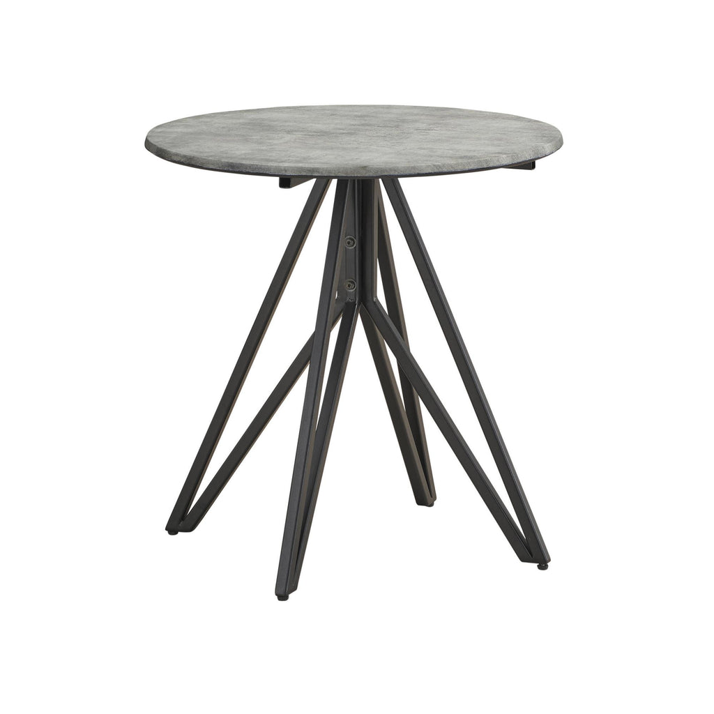 Industrial elements and sleek modern lines bring forth this modern end table. A metal butterfly-like base design of open and flared hairpin style legs in a gunmetal finish offer a striking visual interest to the furniture piece and the room in which is rests. Placed on top of the chic base is a round tabletop that portrays a molded cement for a rustic modern farmhouse flair. The cement-inspired top also offers a textured sandy feel to resemble the true material. Place this modern side table beside an accent chair or allow it to showcase a sculpture or art piece in a loft studio.