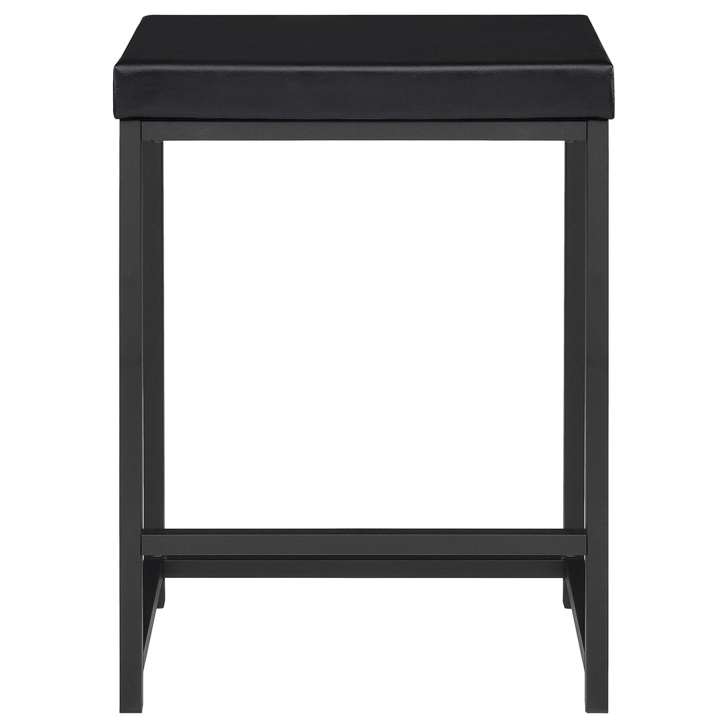 Two stools are backless, with black finish bases and faux leather upholstery over foam padding