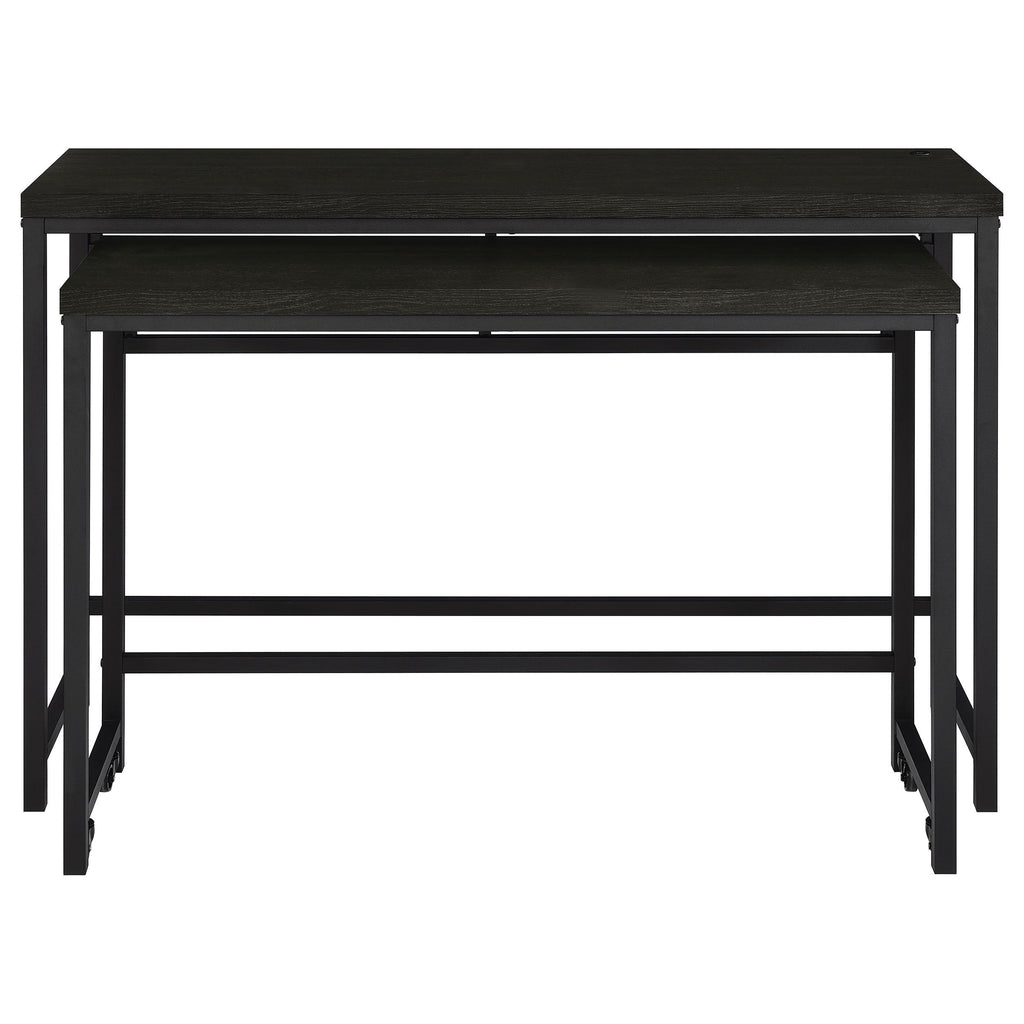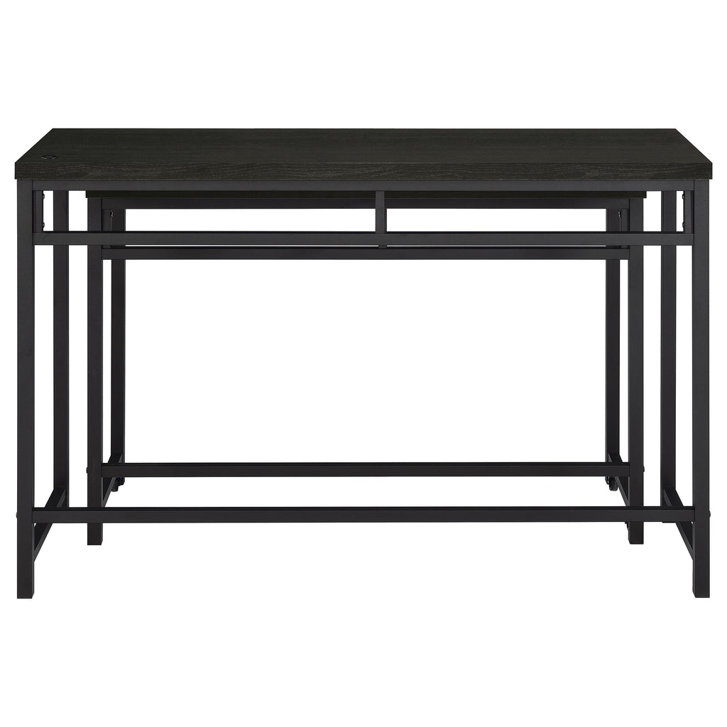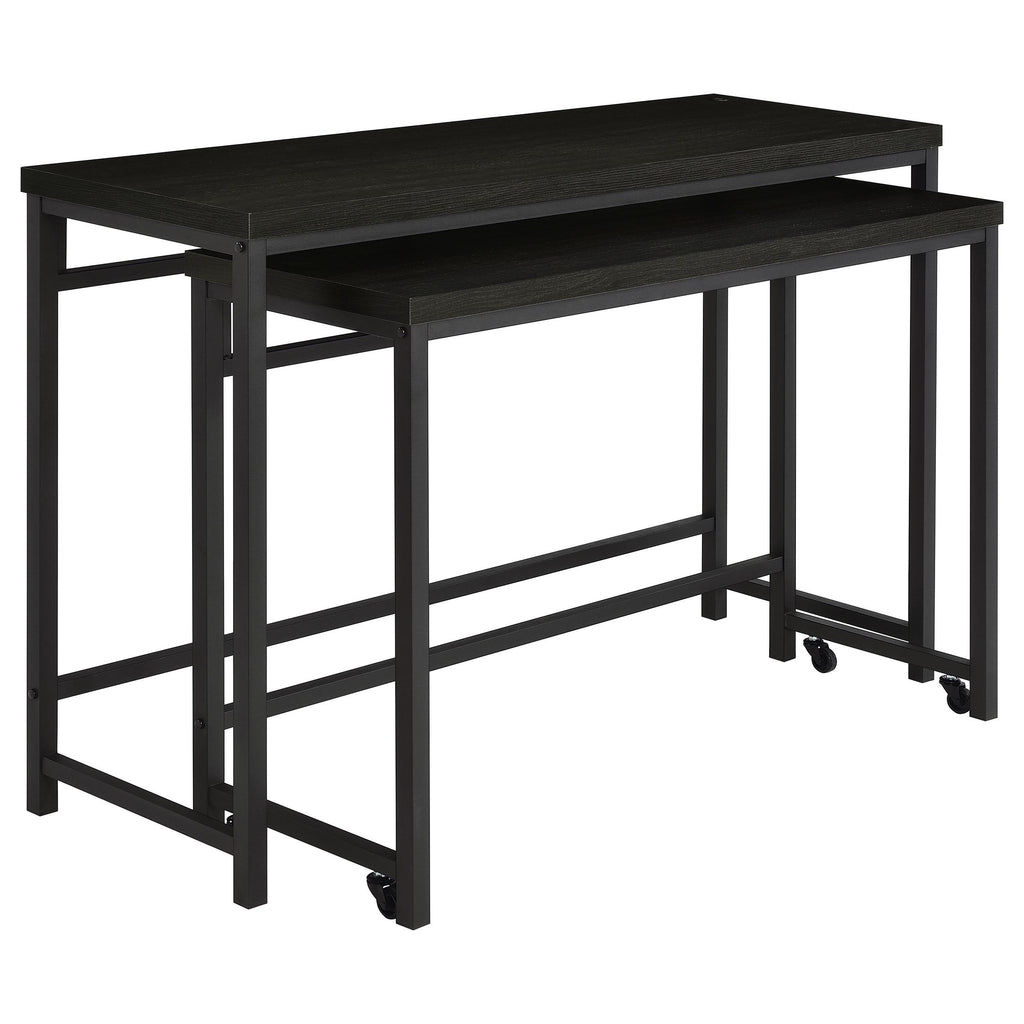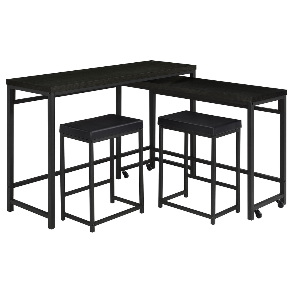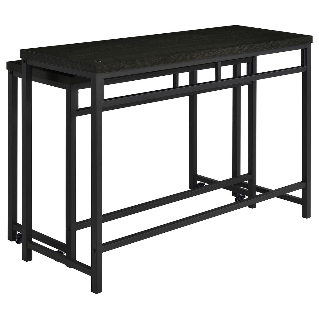 When space is at a premium, this modern four-piece counter height dining set does everything you need and more, easily serving as dining table, workspace, or homework spot. It features clean, crisp design with straight lines and square corners, all in a black finish that blends into surrounding decor in virtually any setting. The larger table includes a USB port in its top, while the smaller nesting table is on wheels that allow for easy movement to the perfect position for every occasion. Two stools are backless, with plush foam cushions and faux leather upholstery. Built in footrests offer added comfort and support for all to enjoy.