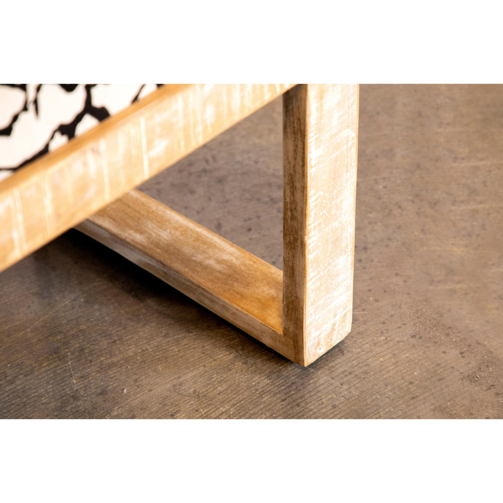 This unexpected accent bench provides a unique element in your living space. Its soft abstract fabric brings plenty of visual appeal. With a black and white motif, you can easily blend it in with your existing decor. The wood frame of the bench is weathered for a slightly rustic appeal. Place this piece in an entryway and instantly improve its style.